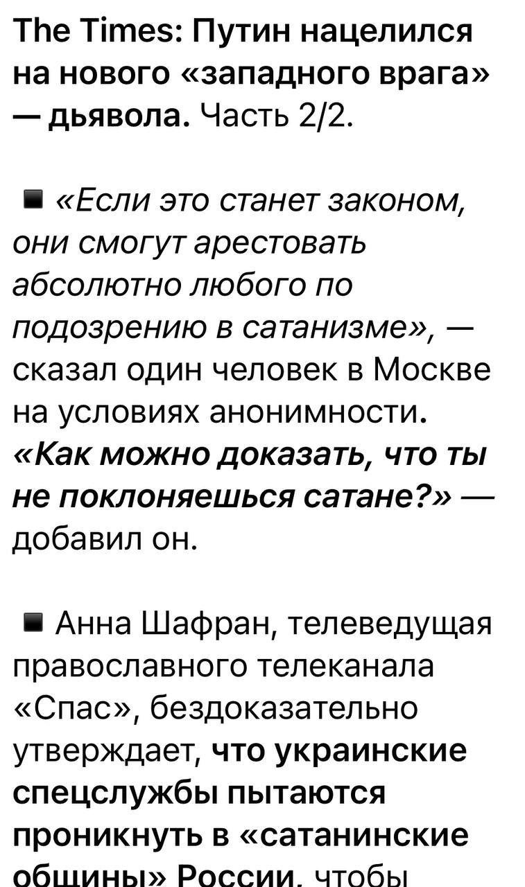 Причём, что характерно, возбудились не только наша отечественная пятая колонна, а также сочувствующие пониманию свободы как вседозволенности, но и наши вековые враги с Туманного Альбиона - накануне издание «The Time» озаботилось проблемой запрета сатанизма в России. Очевидно, раз так штормит всех этих персонажей, значит, попали в самую точку. Собственно, для политиков и общественных деятелей, имеющих более широкие горизонты видения, учитывающие ещё и духовную сторону происходящего, это всегда было очевидно.