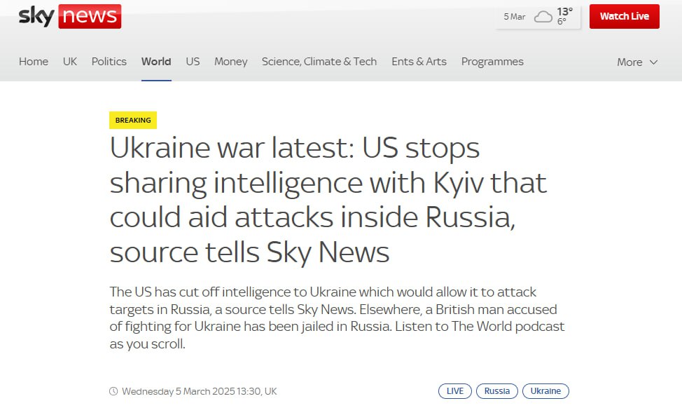 В связи с прекращением снабжения Киева разведданными, дальние удары по территории России значительно осложняются, — пишет Sky News, в очередной раз подтверждая то, что без помощи США такие удары были невозможны.