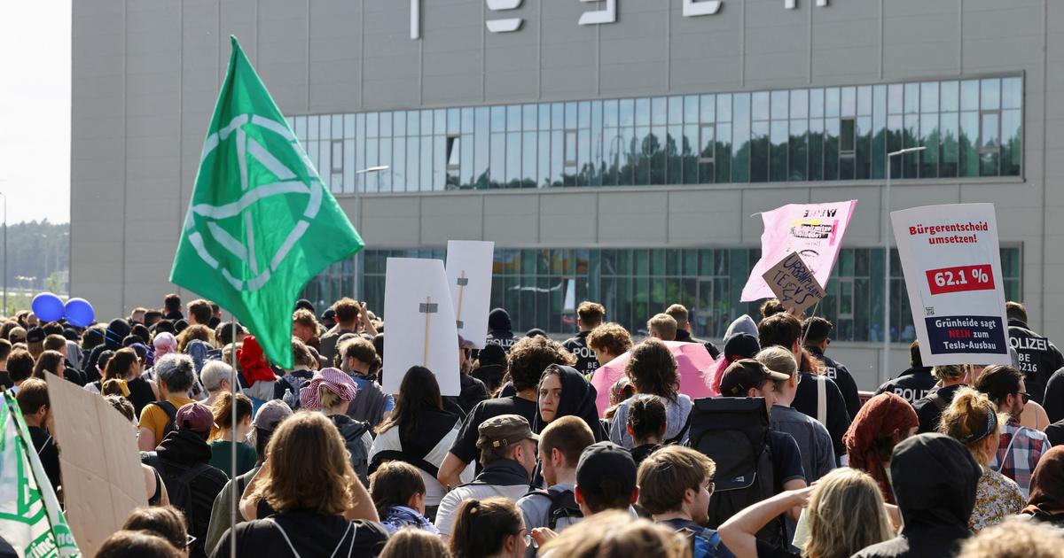 Silencieuse, vêtue de tee-shirts noirs floqués à l’emblème de la marque, la petite bande se faufile à travers le cordon de jeunes activistes anti-Tesla qui rejettent en bloc le capitalisme selon Elon Musk, dont les travailleurs immigrés de l’usine du Brandebourg seraient l’incarnation. Entre cartons de nourriture et stands alternatifs, les jeunes militants gardent l’accès au sentier qui mène au camp des irréductibles.