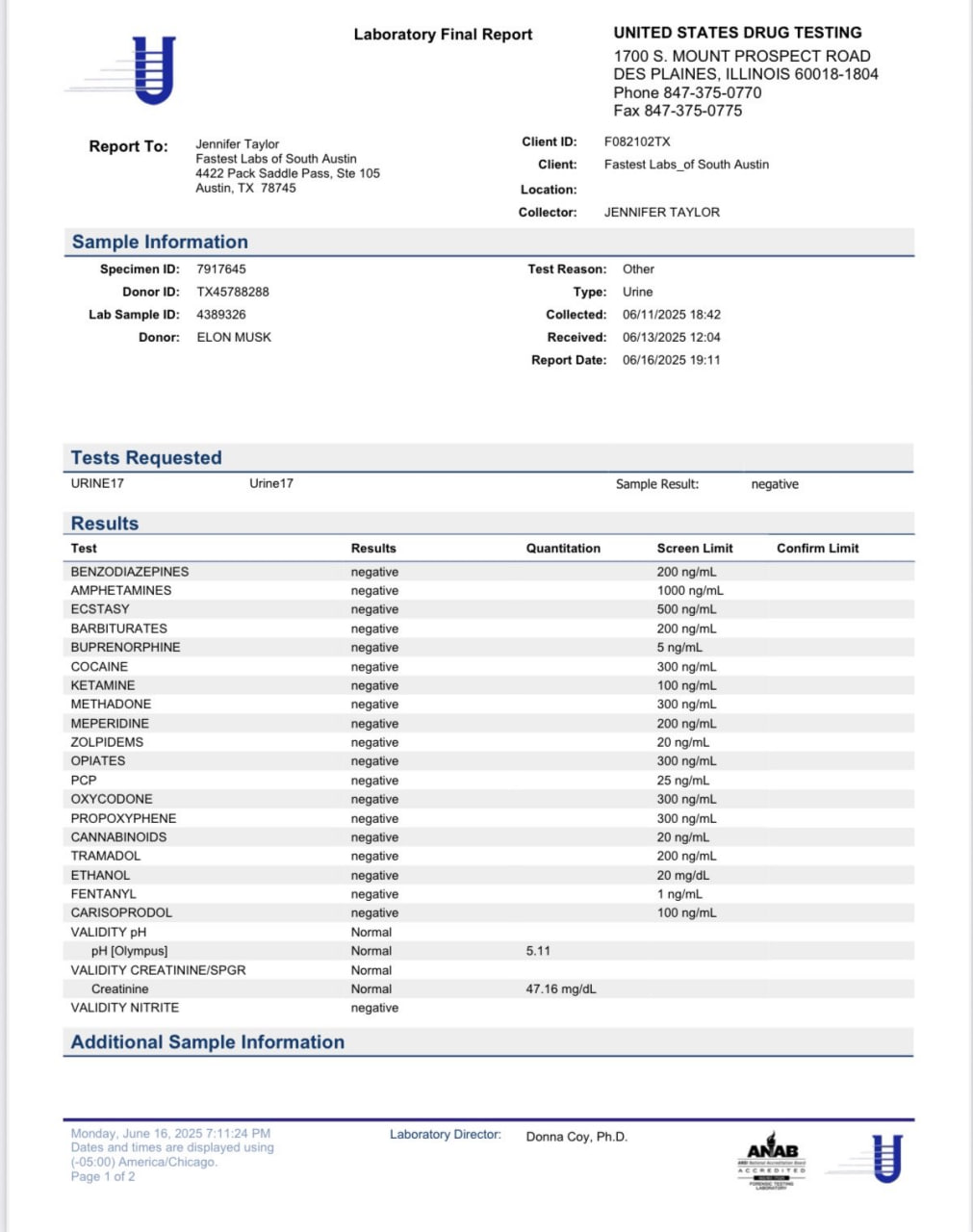 Илон Маск показал результаты своего теста на наркотики: запрещённые вещества не нашли.