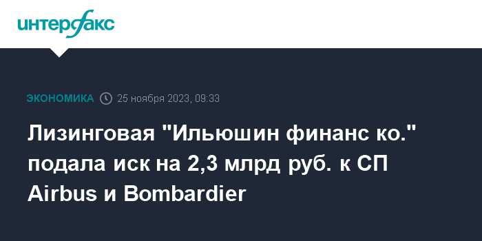 Москва. 25 ноября. INTERFAX.RU - Лизинговая компания "Ильюшин финанс ко." (ИФК, входит в ПАО "Объединенная авиастроительная корпорация" "Ростеха") подала иск в Арбитражный суд Москвы к Airbus Canada Limited Partnership - совместному предприятию Airbus и Bombardier, отвечающему за выпуск узкофюзеляжных пассажирских самолетов Airbus A220.