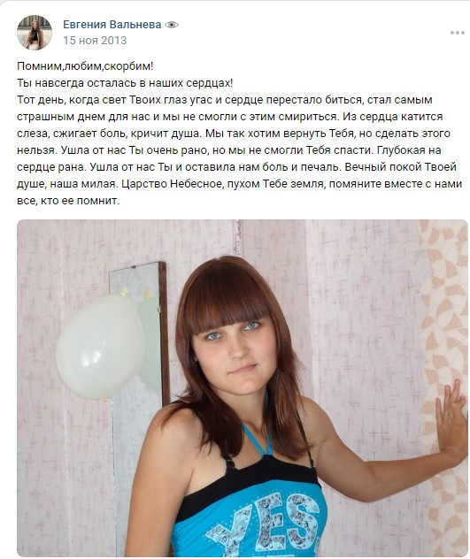 — Тот день, когда свет твоих глаз угас и сердце перестало биться, стал самым страшным днем для нас, и мы не смогли с этим смириться. Из сердца катится слеза, сжигает боль, кричит душа, — писала сестра Анастасии Вальневой.