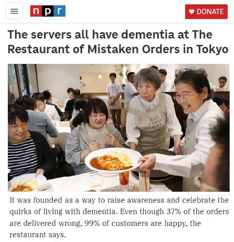 В Токио есть ресторан «ошибочных заказов», в который на работу официантов принимают только людей с деменцией. Такая игра – никогда не знаешь, что тебе принесут. Хозяин заведения специально так устроил, чтобы привлечь внимание общественности к проблеме деменции. Несмотря на то, что в 37% случаев клиентам ресторана приносят не то, что они просили, 99% из них остаются довольны.