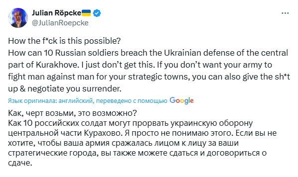 «Как 10 российских солдат могут прорвать украинскую оборону центральной части Курахово. Я просто не понимаю этого», – эмоционально возмутился журналист Bild Юлиан Рёпке на своей странице в соцсети.