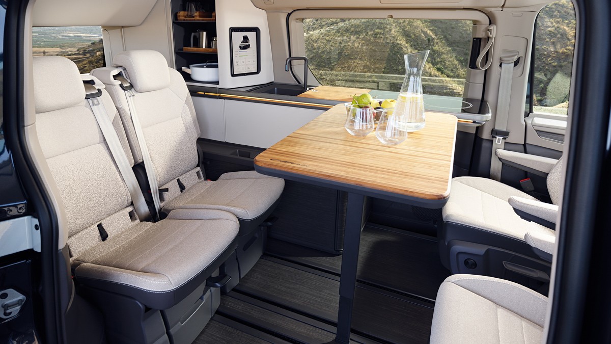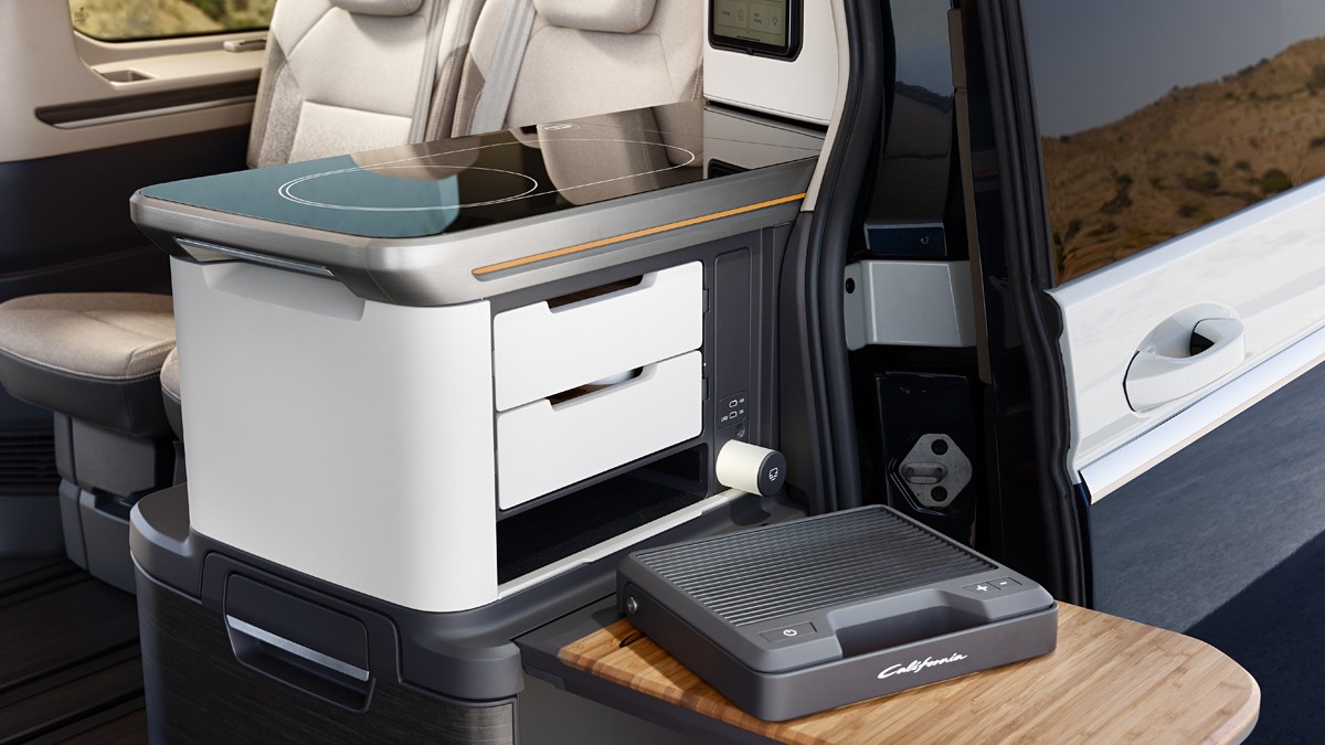 Одной из важнейших особенностей California Concept является пара раздвижных дверей. У предшественников такая дверь всегда была одна, так как вдоль левой боковины кемпера располагалась кухня. Внутреннее пространство «донора» – Volkswagen T7 Multivan – больше, из-за чего удалось сместить кухню ближе к корме, что в свою очередь, позволило разместить ещё одну сдвижную дверь на левой стороне. При этом кухня расположена таким образом, что гости автокемпингов могут пользоваться ей как внутри автомобиля, так и снаружи. Ещё у отдыхающих есть доступ к холодильнику в том числе и снаружи.