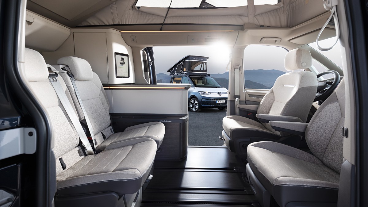 Презентация предсерийного концепта Volkswagen California на базе Multivan T7 прошла в рамках международной выставки автодомов, фургонов и автотуризма Caravan, которая ежегодно проводится в Дюссельдорфе в конце августа – начале сентября. У новой Калифорнии, как и у её предшественников, в крышу интегрирован спальный бокс, изготовленный из алюминия и тканевыми боковинами. Он опускается и поднимается с помощью планшета, который управляет всей электроникой в автомобиле. Кстати, этот планшет выполняет в том числе и развлекательную функцию.