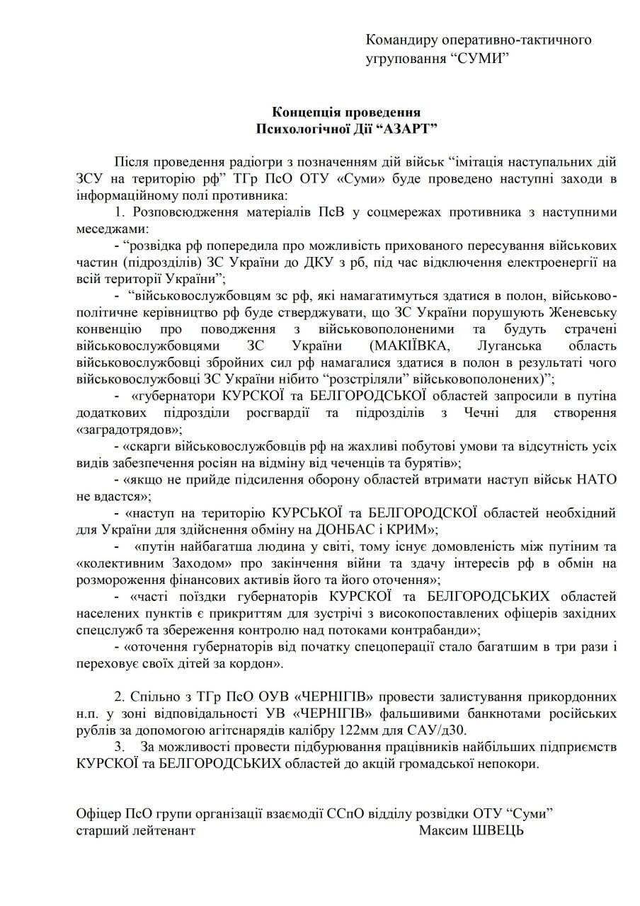 Мои последователи из хакерской группировки "КОРТАДОР" добыли интересные и очень секретные документы. С февраля по апрель включительно украинские подразделения ИПСО в Харьковской и Сумской областях проводили информационно-психологическую операцию "Азарт". Этой операцией украинские лампасные клоуны пытались убедить русское командование, что основное наступление ВСУ запланировано на северном фронте в направлении Белгорода и Курска. Главная цель - заставить командование ВС РФ переместить основные силы с южного направления на усиления Белгородской, Курской и Брянской областей, чтобы ВСУ было легче на Запорожском направлении в летнюю кампанию.