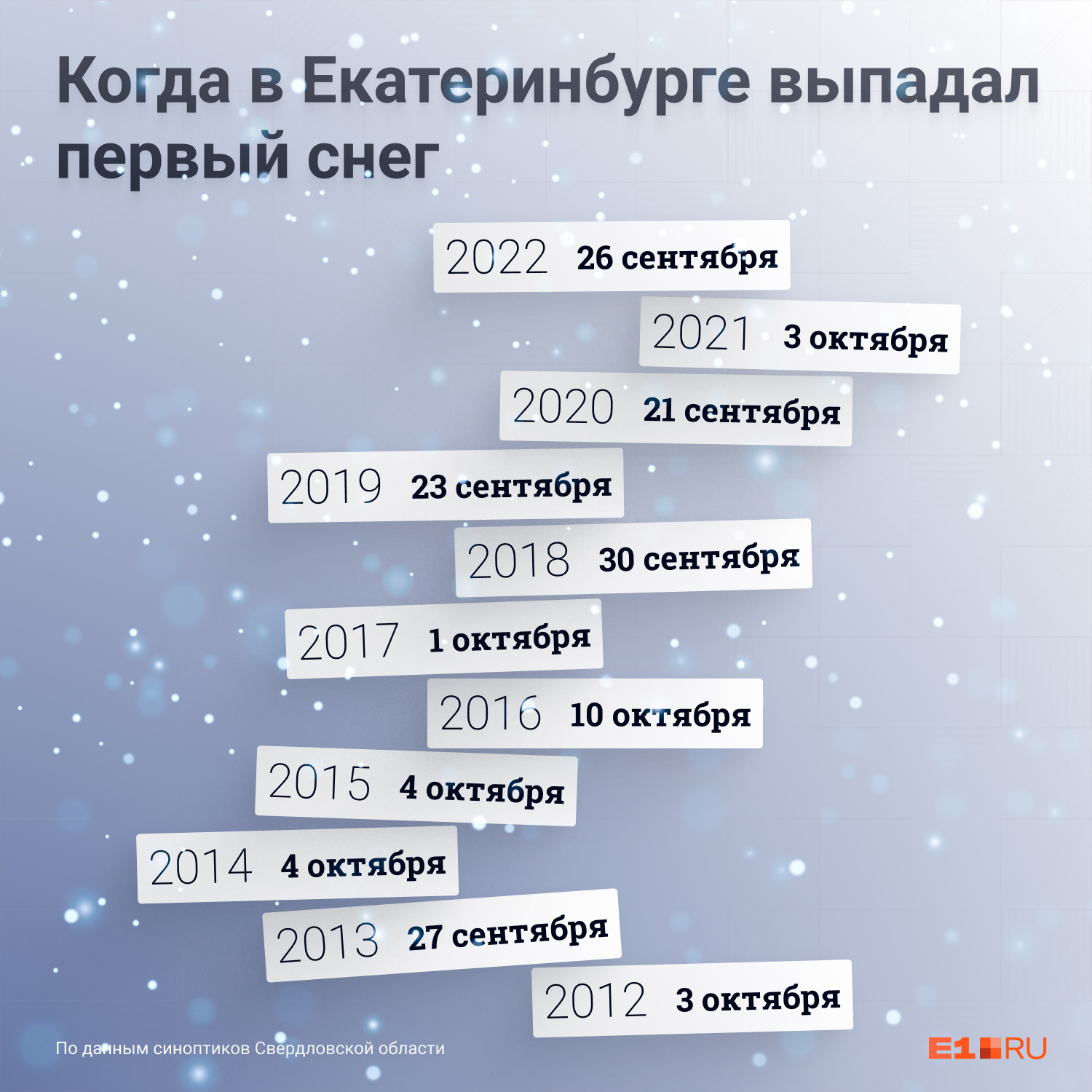 За последние 11 лет о первом снеге мы писали, как правило, в последнюю декаду сентября или начале октября. В 2022-м, например, Екатеринбург завалило снегом 26 сентября. Город тут же встал в пробки, а на дорогах произошла масса аварий.