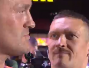 Однако, традиционная «битва взглядов» не состоялась. Боксёры вышли на подиум, и Усик честно «сверлил» соперника взглядом, в то время как Фьюри даже не взглянул на Александра, всё время смотря в сторону публики.