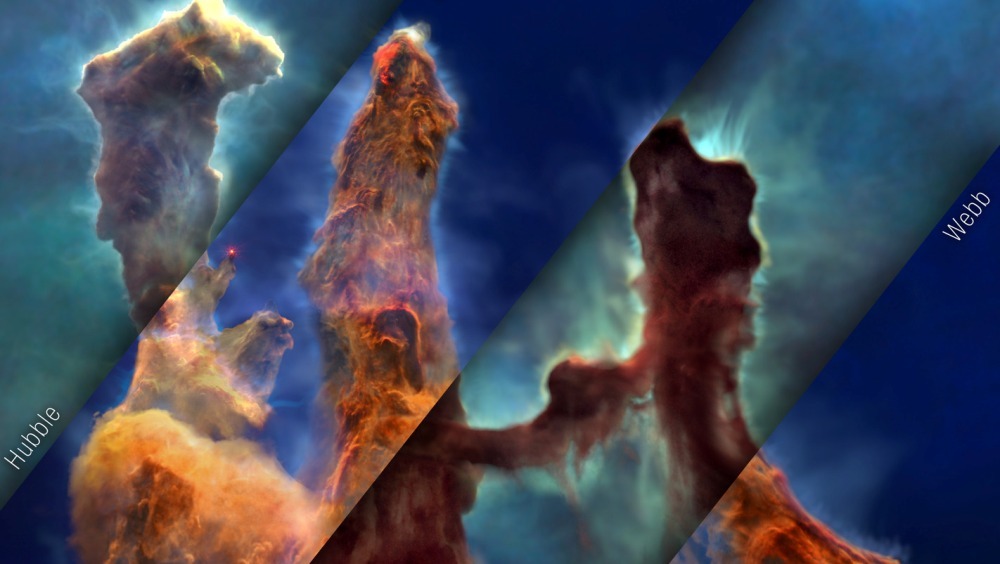 В апреле 1995 года было выпущено знаковое изображение, получившее название «Столпы творения». Его сделал космический телескоп «Хаббл». Совсем недавно эту область космоса сфотографировал телескоп им. Джеймса Уэбба. Астрономы объединили данные и создали потрясающий трехмерный анимационный полет через туманность.