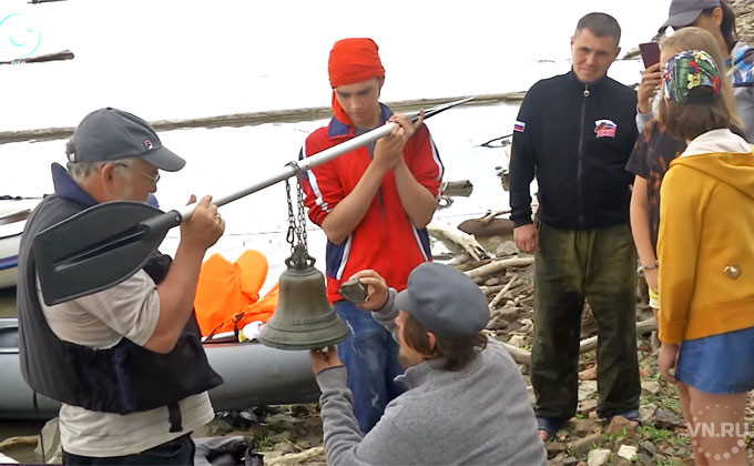 Звонари из Ярового вместе с новым экспонатом прибывают на байдарках. Их встречают перезвоном колоколов.