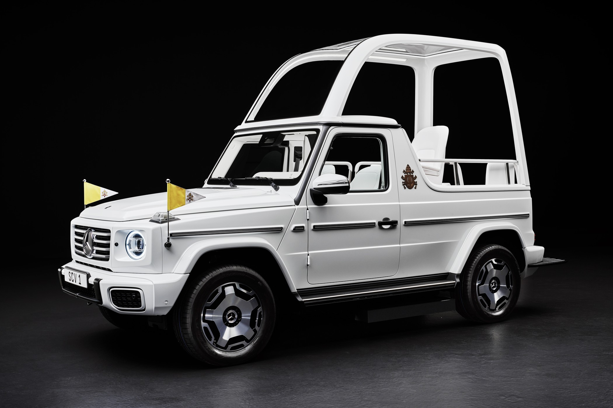 Компания Mercedes-Benz за свою историю сделала несколько эксклюзивных версий G-класса для Папы Римского, последний образец был представлен в декабре 2024 года — это пикап на базе электрического Mercedes-Benz G 580 with EQ Technology.