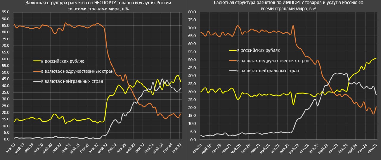 Валюты недружественных стран по экспорту товаров и услуг: 19% в янв.25, за 3м – 17.4%, за 6м – 17.9%. за 12м – 18.1% vs 31.8% в 2023 и 84.6% в 2021, а по нейтральным валютам – 38% в январе, за 3м – 36.8%, за 6м – 38.1%, за 12м – 39.5%, в 2023 – 29.1% и 1.1% в 2021.
