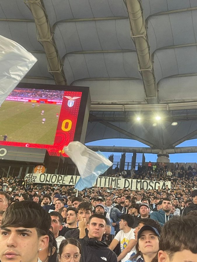 ❗️Во время римского дерби фанаты футбольного клуба «Лацио» выразили соболезнования в связи с терактом в «Крокус сити холле», растянув баннер со словами «В память о жертвах теракта в Москве».