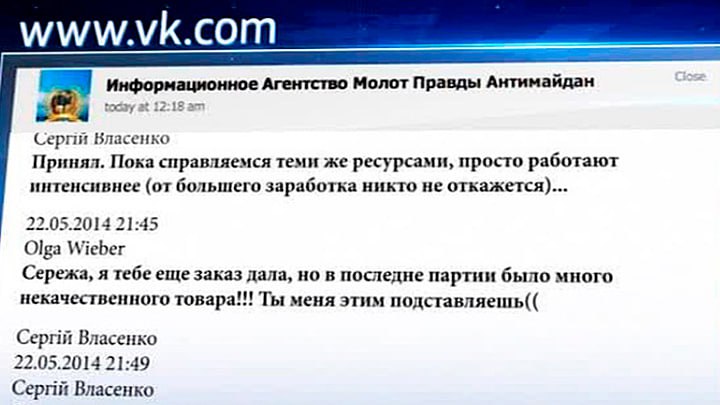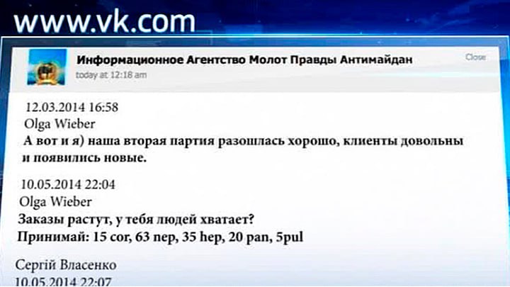 В марте 2014-го Вибер передала Власенко новый заказ и заявила, что "наша вторая партия разошлась хорошо, клиенты довольны". Она также поинтересовалась, не собирается ли Киев останавливать карательную операцию.