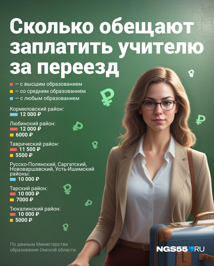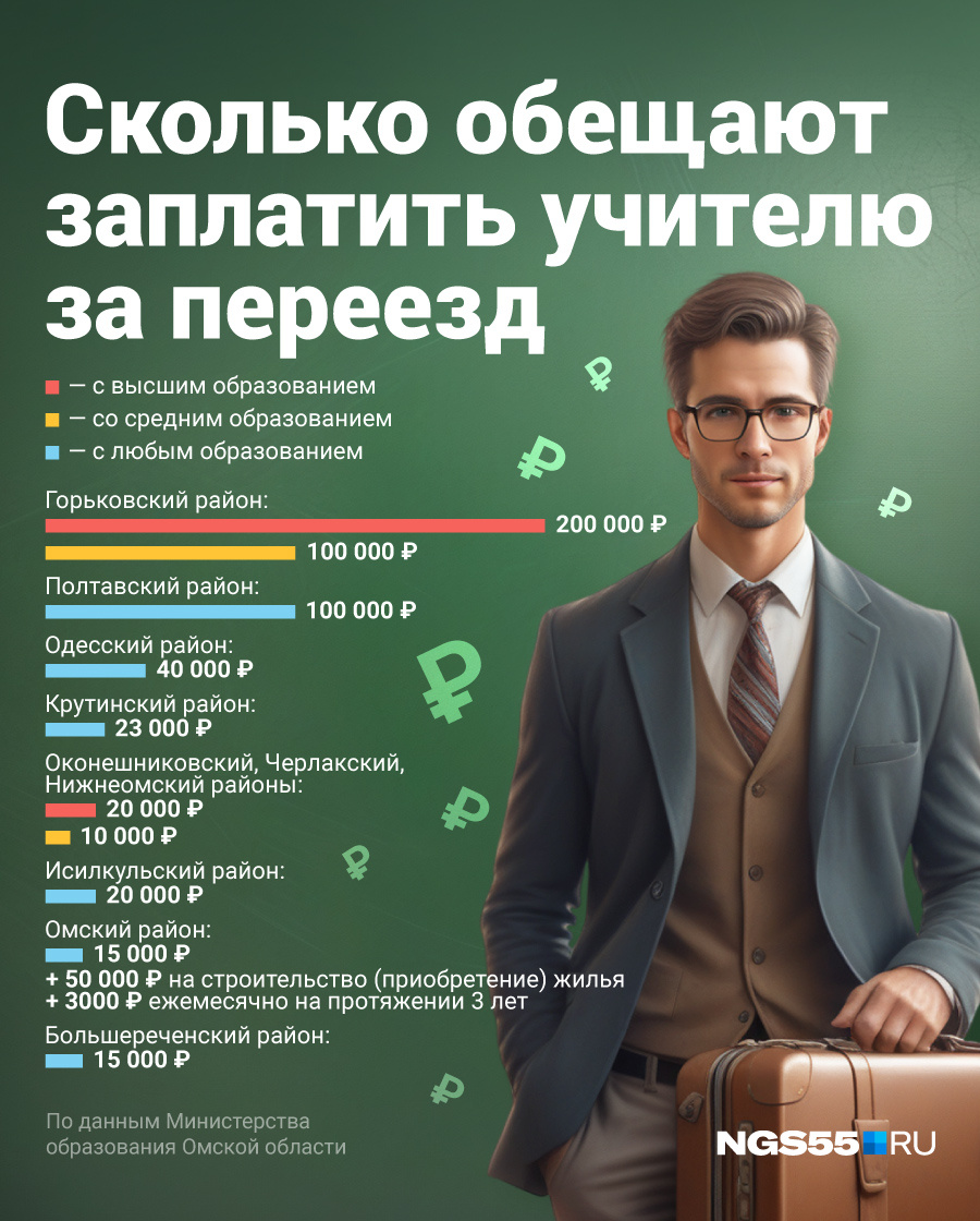 Власти всех уровней заманивают учителей на работу в сельские школы Омской области рублем и жилыми метрами. Например, на протяжении нескольких лет практикуется федеральная программа «Земский учитель», когда педагогам, переехавшим из города в глубинку нашего региона, выплачивают 1 миллион рублей (при условии, что он отработает 5 лет). В марте этого года в правительстве Омской области решили выплачивать молодым специалистам двойной оклад (их стаж должен быть менее трех лет), а главы районных муниципалитетов предлагают выпускникам педагогических вузов подъемные. Как сообщили в региональном Министерстве образования, единоразовую выплату готовы предложить в 19 районах области. Например, в Оконешниковском, Черлакском и Нижнеомском районах новоиспеченным учителям с высшим образованием заплатят 20 тысяч рублей, в Любинском районе — 15. Среди всех выделяются Горьковский и Полтавский районы. Там суммы куда внушительнее — 200 и 100 тысяч рублей соответственно. Разбираемся почему.