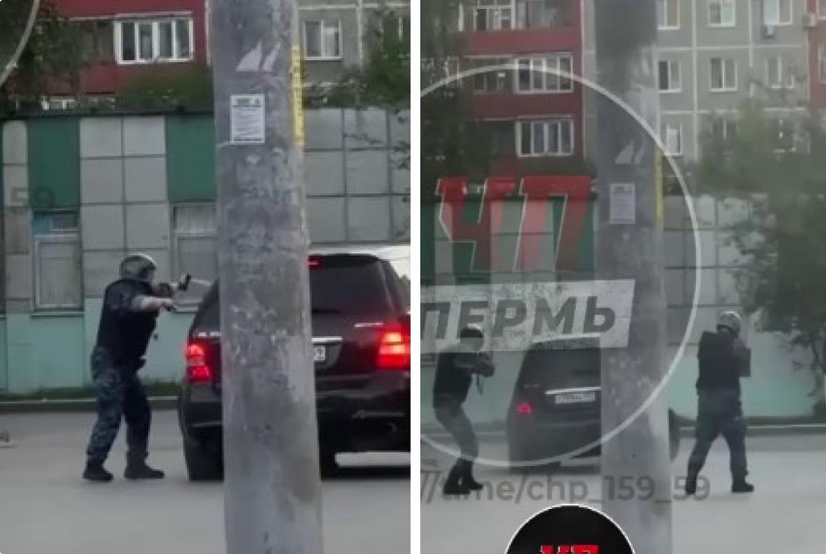 Вечером 16 июля двое росгвардейцев расстреляли Mercedes у продуктового магазина и жилых домов на Желябова и, судя по кадрам, пробили колеса авто. Водитель попытался скрыться.