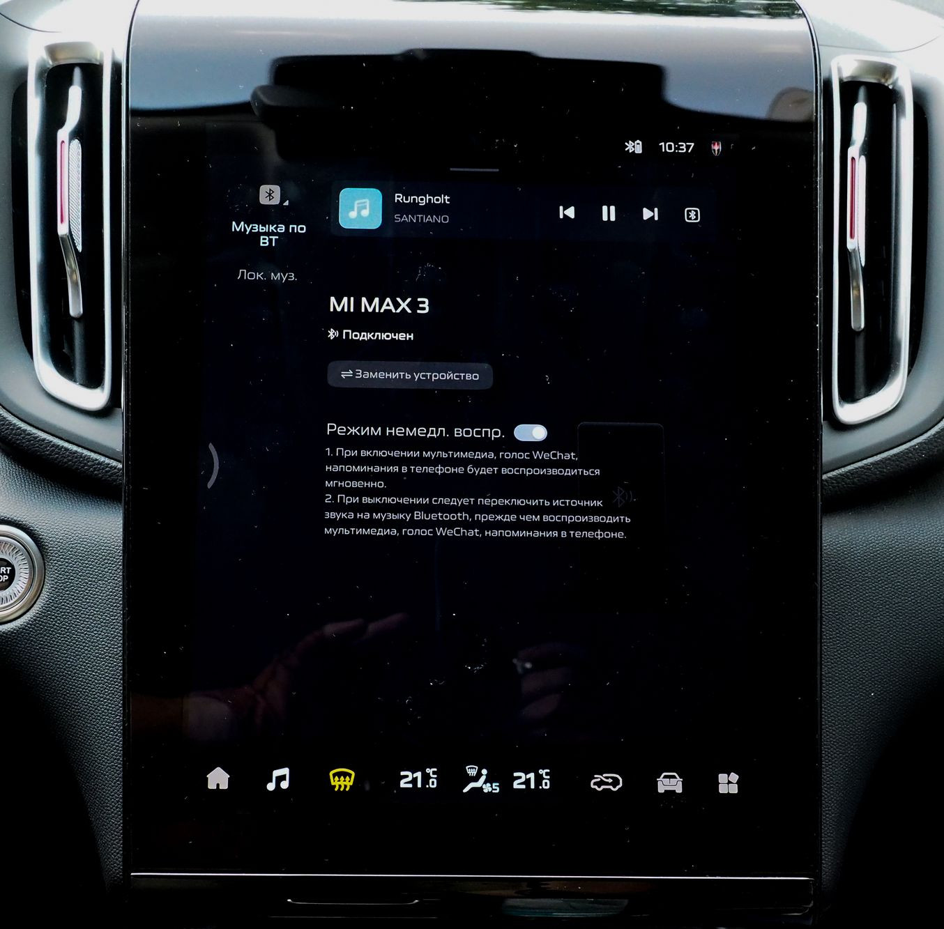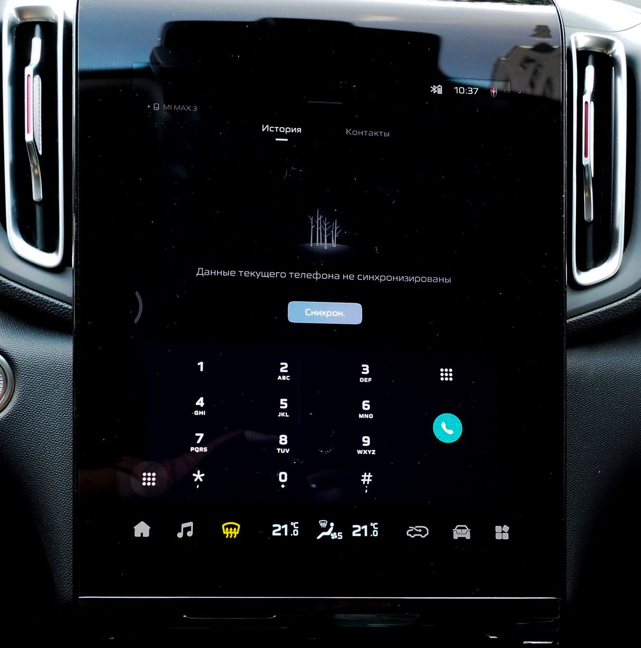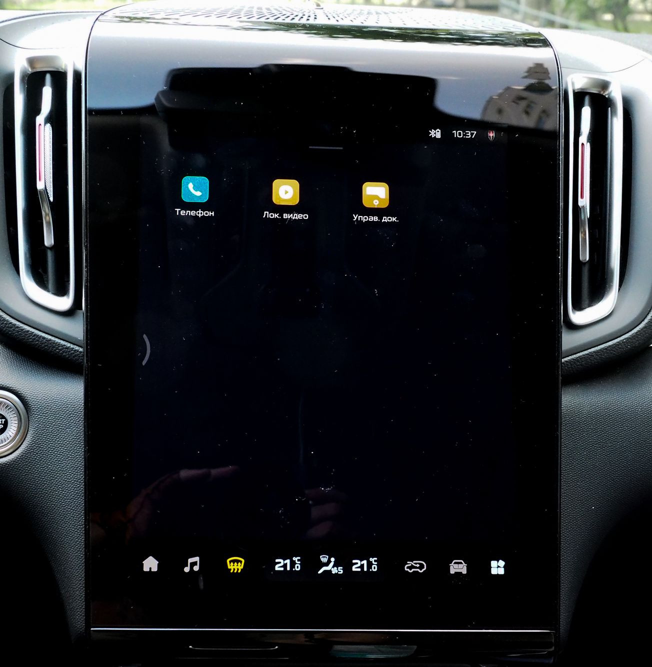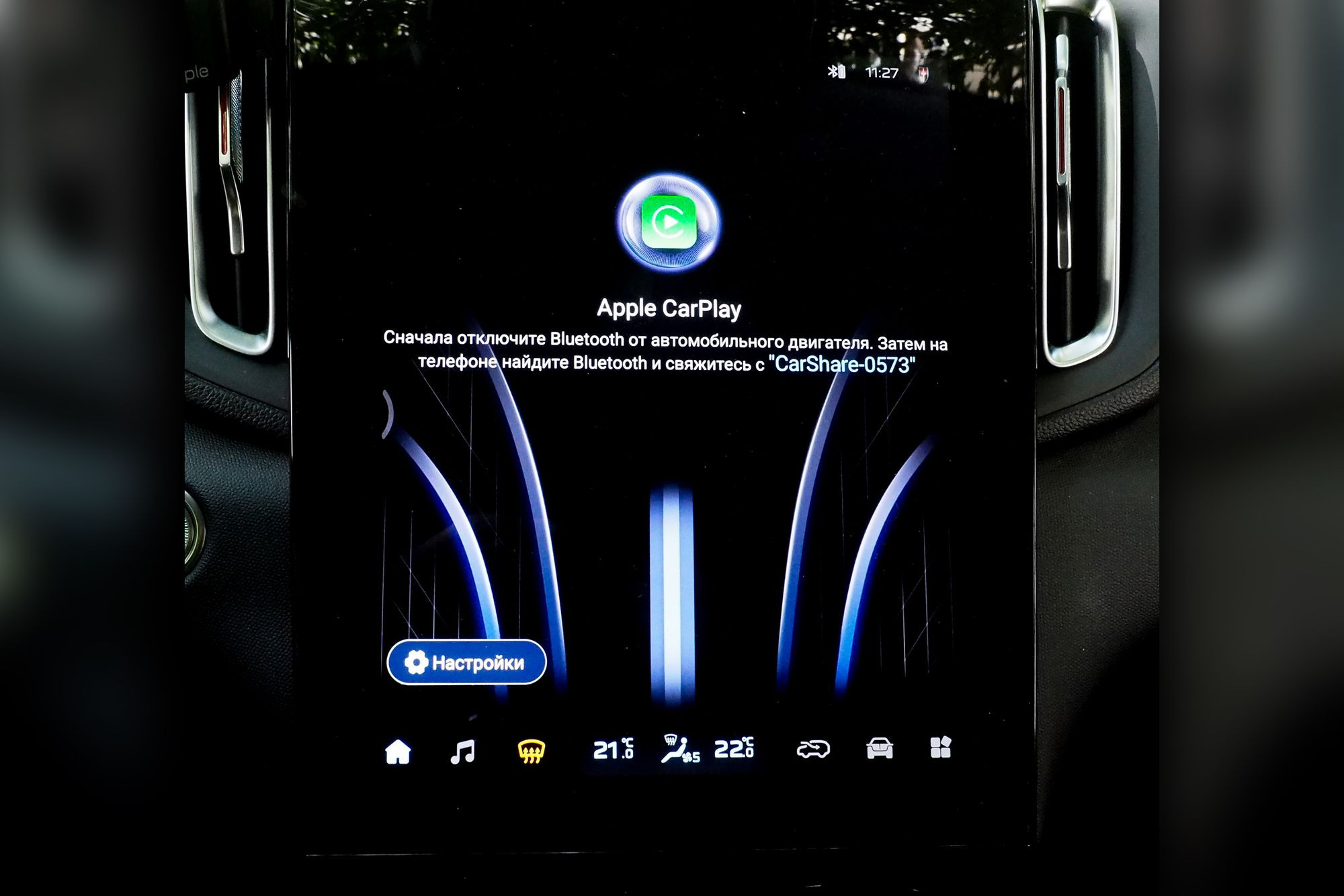 Головное устройство вообще стало главным разочарованием в этом автомобиле. Мы уже привыкли, что на главном экране расположено довольно много иконок разнообразных приложений, и среди них обязательно будут приложения, обеспечивающие интеграцию со смартфонами. А тут – пустота! Чтобы как-то компенсировать отсутствие программ интеграции, в представительстве дополнили оснащение машины отдельным гаджетом. Он имеет вид подключенной к слоту USB коробочки с собственным приемником Bluetooth. В результате при запуске автомобиля появляется экран с иконкой Apple CarPlay и надписью «Сначала отключите Bluetooth от автомобильного двигателя. Затем на телефоне найдите Bluetooth и свяжитесь с CarShare — 0573». Но у меня телефон на Андроиде! Ну да, коробочку он увидел – но на этом все и закончилось. Пришлось для навигации вешать телефон на кронштейн. Согласитесь, обидно смотреть на экранчик телефона с картой, тогда как рядом с ним 12,6-дюймовый «телевизор», на который можно вывести разве что список FM-радиостанций или часы.
