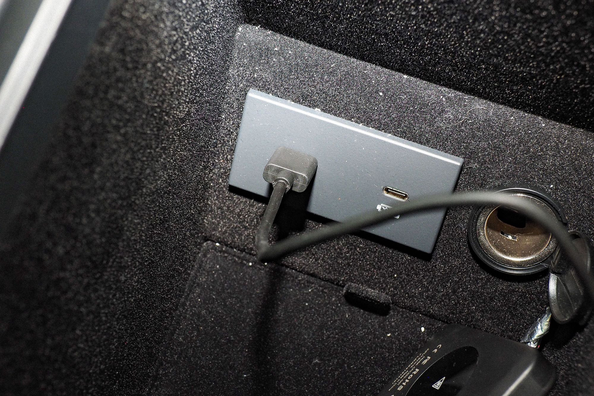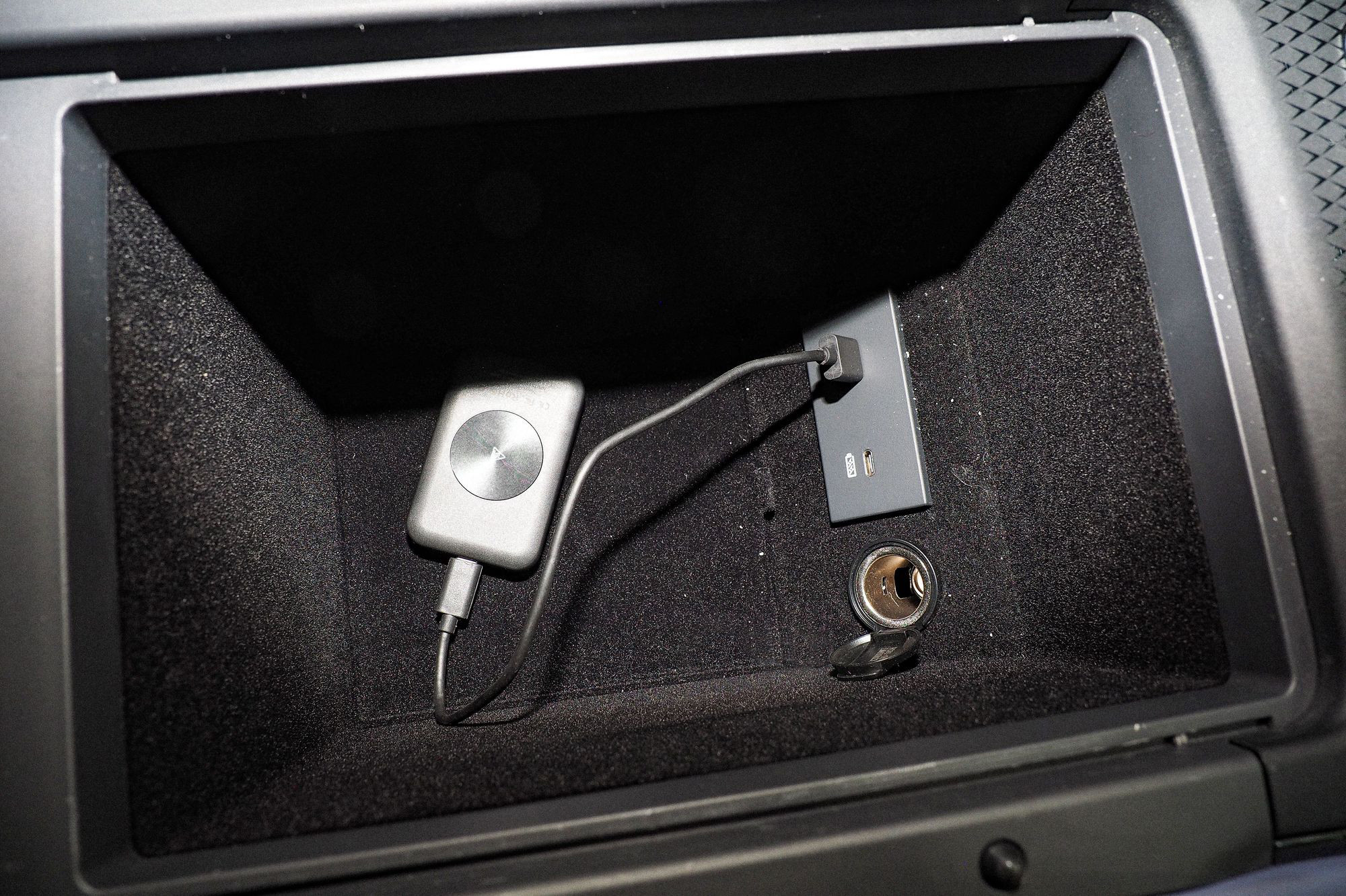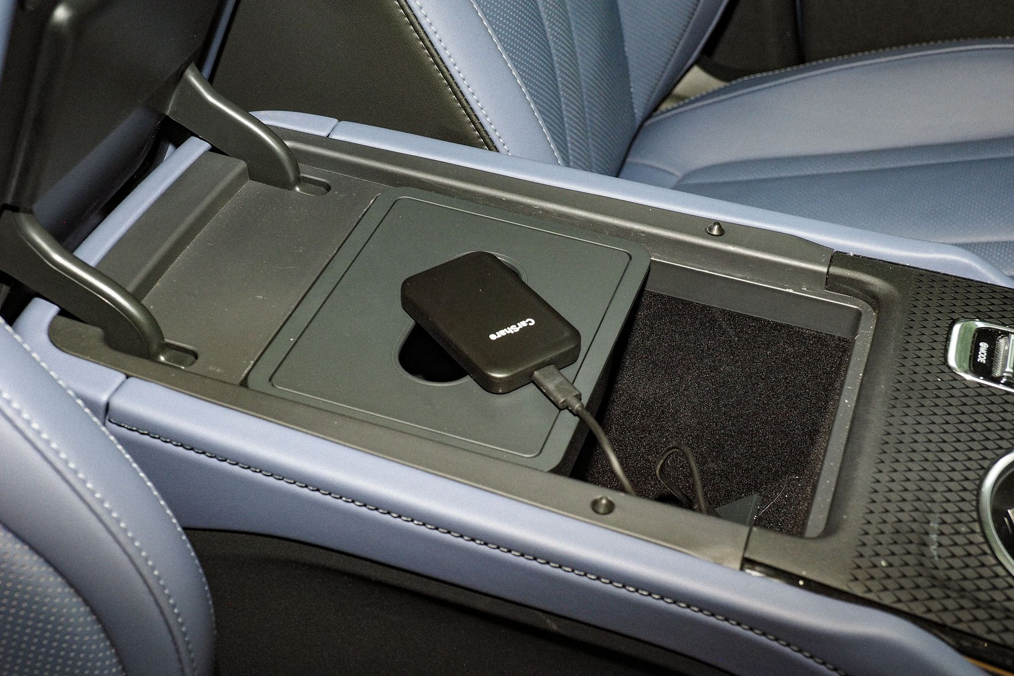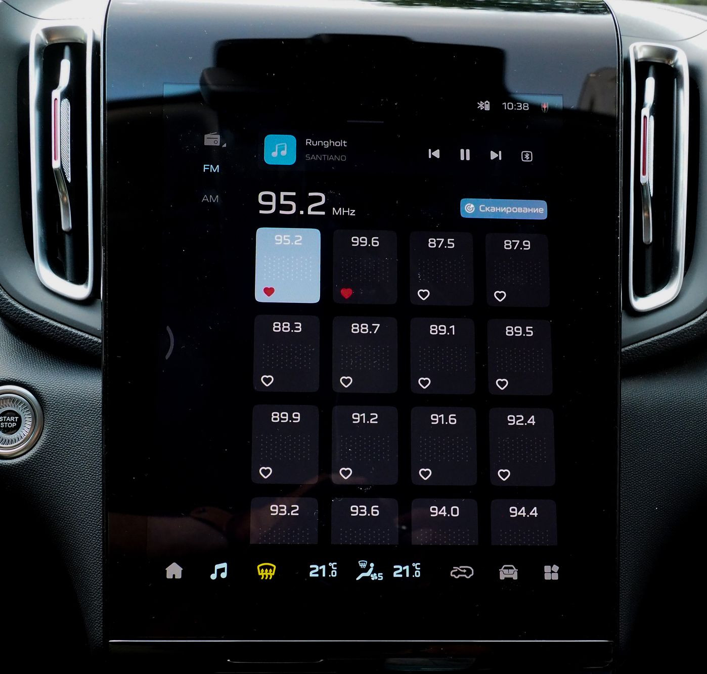 Головное устройство вообще стало главным разочарованием в этом автомобиле. Мы уже привыкли, что на главном экране расположено довольно много иконок разнообразных приложений, и среди них обязательно будут приложения, обеспечивающие интеграцию со смартфонами. А тут – пустота! Чтобы как-то компенсировать отсутствие программ интеграции, в представительстве дополнили оснащение машины отдельным гаджетом. Он имеет вид подключенной к слоту USB коробочки с собственным приемником Bluetooth. В результате при запуске автомобиля появляется экран с иконкой Apple CarPlay и надписью «Сначала отключите Bluetooth от автомобильного двигателя. Затем на телефоне найдите Bluetooth и свяжитесь с CarShare — 0573». Но у меня телефон на Андроиде! Ну да, коробочку он увидел – но на этом все и закончилось. Пришлось для навигации вешать телефон на кронштейн. Согласитесь, обидно смотреть на экранчик телефона с картой, тогда как рядом с ним 12,6-дюймовый «телевизор», на который можно вывести разве что список FM-радиостанций или часы.