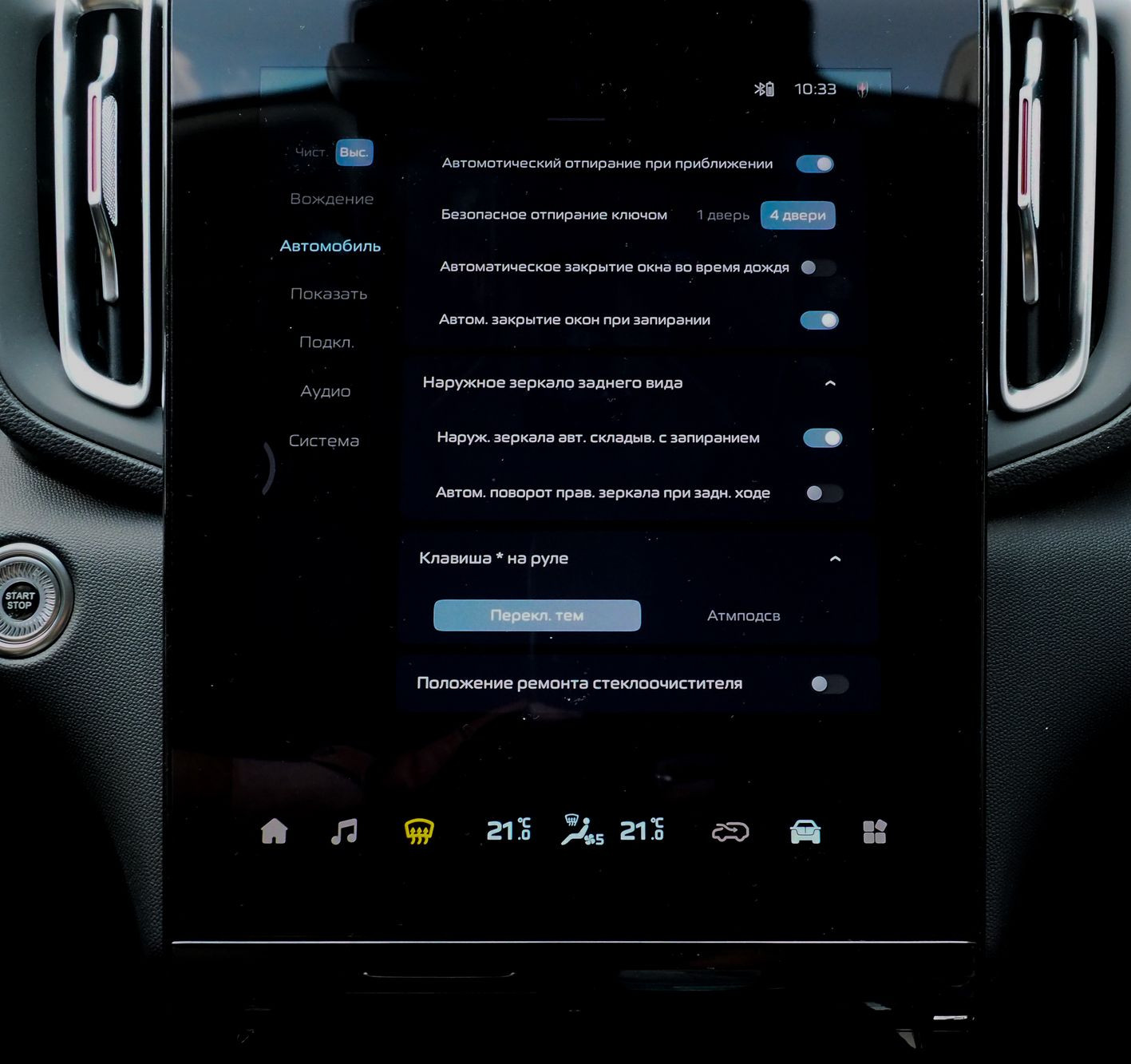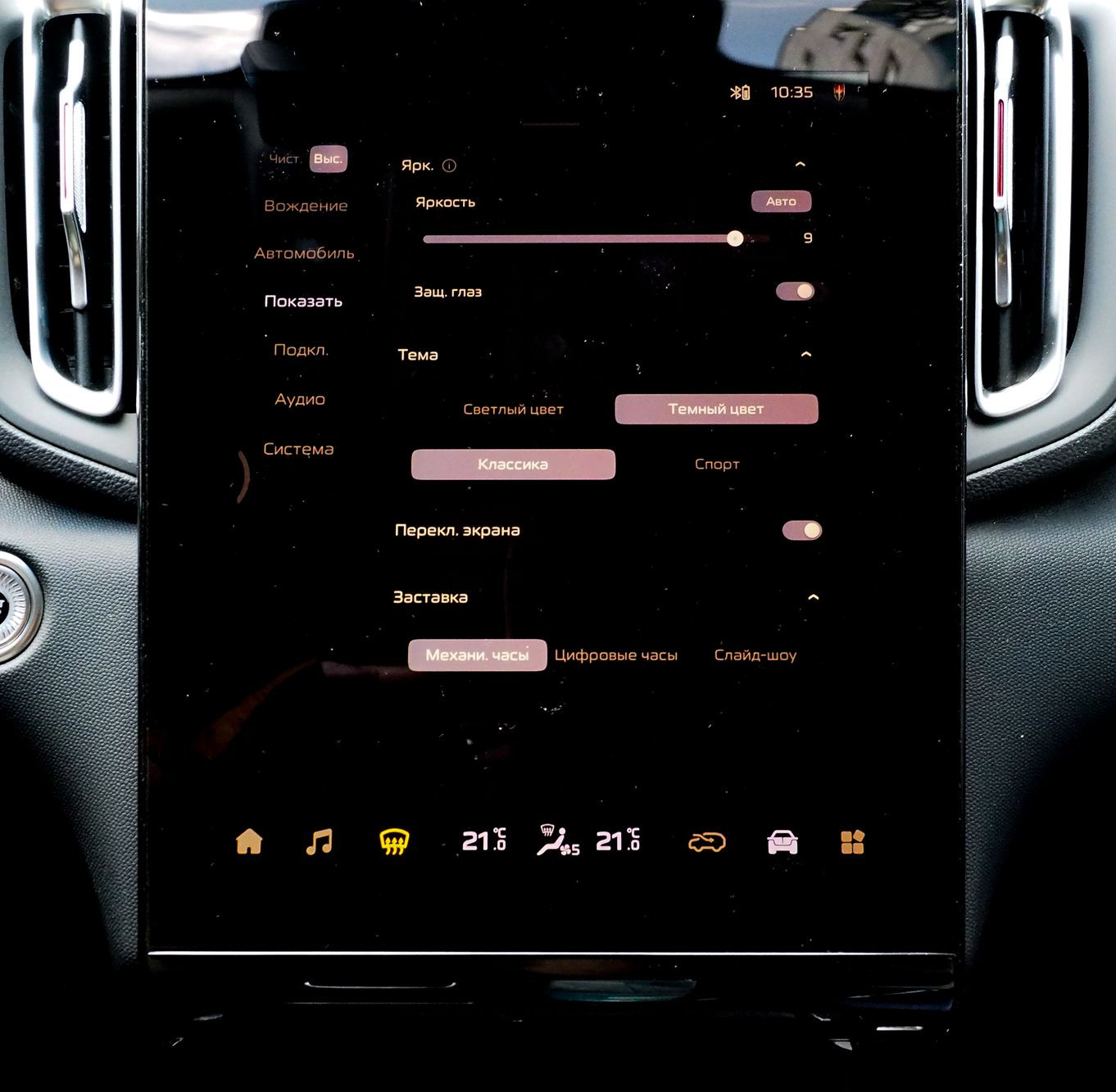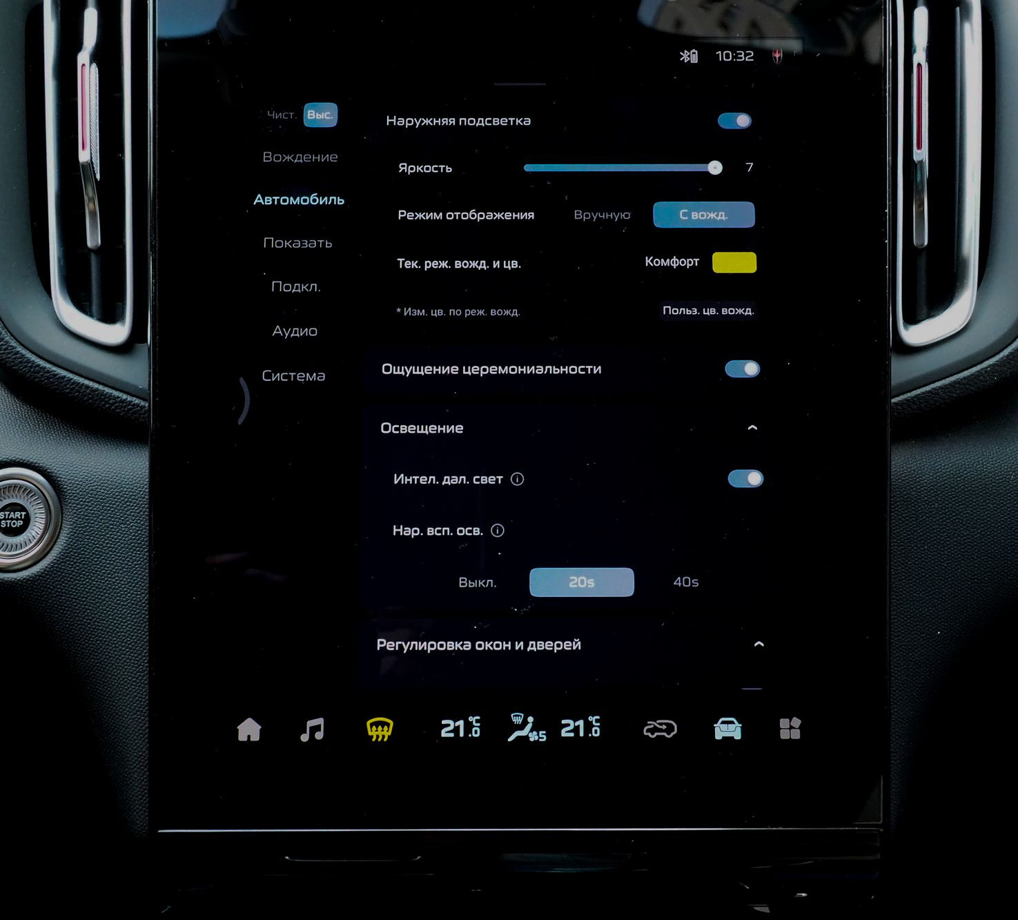 А вот возможности настройки внушают уважение – настроить можно многое. Можно выбрать темную или светлую тему для центрального дисплея, настроить атмосферную подсветку, приветственный и провожающий свет, выбрать, замки каких дверей откроются при нажатии на кнопку на брелоке, включить или выключить интеллектуальный дальний свет, настроить наклон вниз правого зеркала при движении задним ходом и многое другое. Но один пункт, а именно – «Ощущение церемониальности», буквально поставил меня в тупик. Попереключал флажок с положения «Вкл» в «Выкл» и обратно – ничего в автомобиле не меняется! И только когда знающие люди подсказали, что смотреть нужно снаружи в момент открывания и закрывания замков с брелока, я увидел, в чем тут дело. Если «Церемониальность» включена, то на какое-то время красные полоски на капоте, решетке радиатора и крыльях начинают светиться.