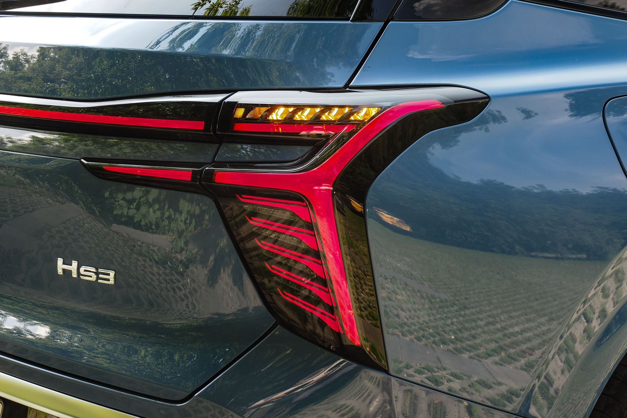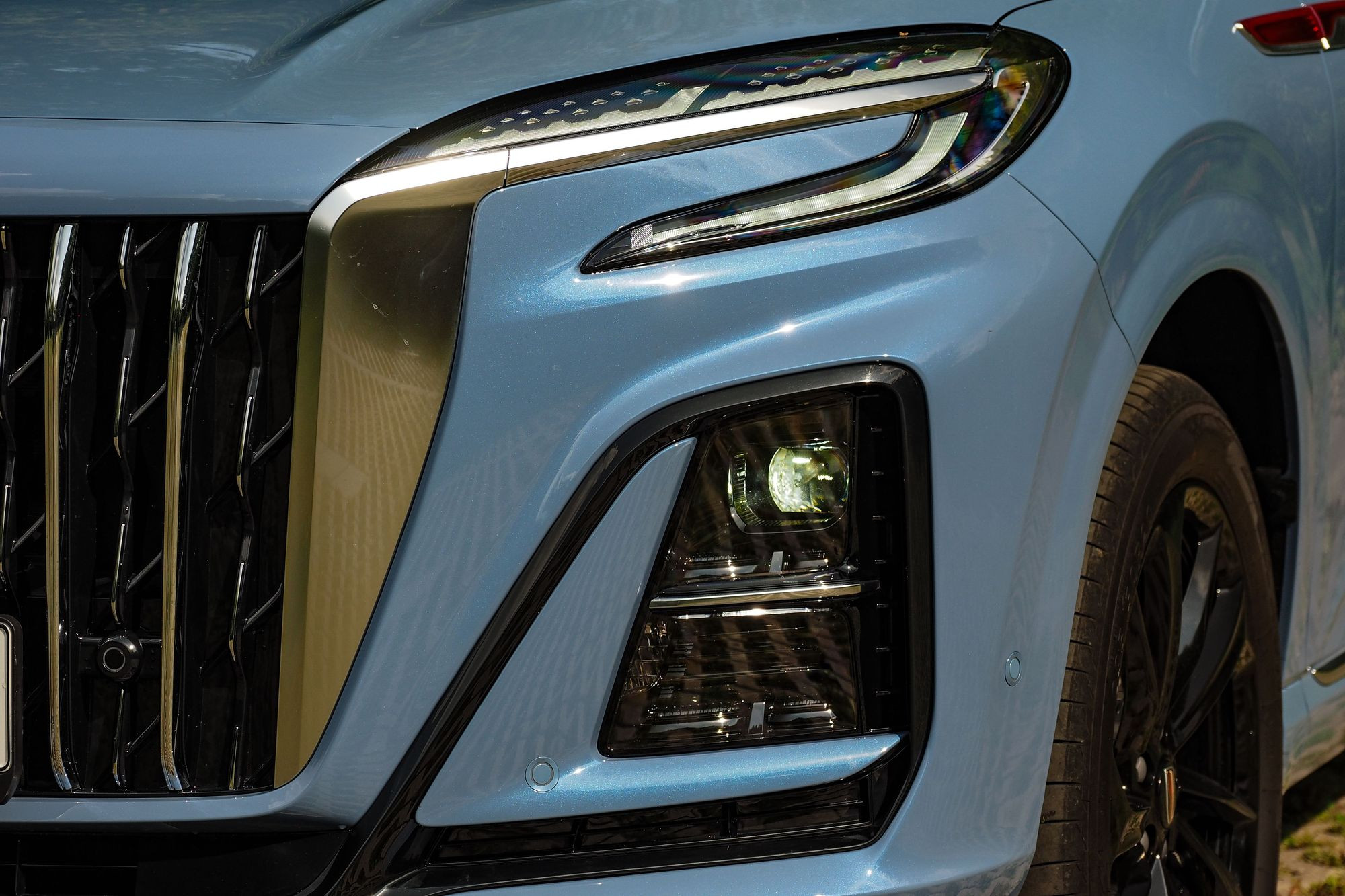 Вообще-то, рассказывая про официальную презентацию модели, которая состоялась в июне этого года, мы поговорили о дизайне Hongqi HS3 весьма подробно. Напомню, что в оформлении автомобиля отчетливо выделяются три темы. Первая – уже упомянутый «водопад». Вторая – это тема красного знамени, которую несложно заметить в фирменных красных внешних элементах: и в вертикальной полоске, надвое рассекающей облицовку радиатора и продолжающейся на передней части капота, и в заходящих на двери декоративных накладках на передних крыльях. Наконец, тема «крыльев орла». Намеки на орлиные крылья можно увидеть и в форме окантовки облицовки радиатора, и в упомянутых красных боковых элементах, и в форме задних фонарей, и в подштамповке в нижней части боковин, и даже в светодиодных дневных огнях, декоративная секция которых содержит 26 «граненых» элементов. Не знаю, почему китайцам так важно, что этих элементов именно 26.