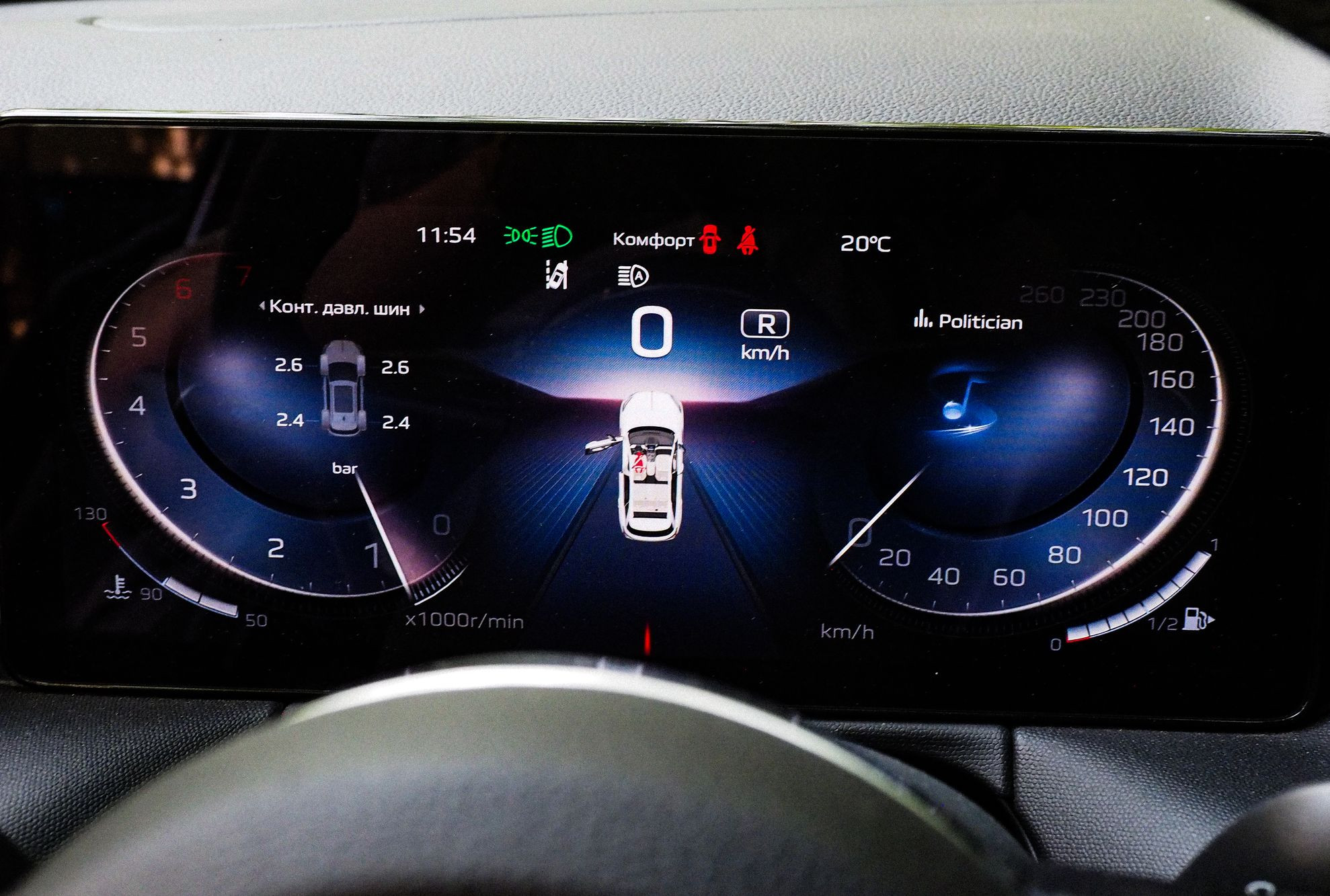 К левому дисплею у меня никаких претензий нет. Все вполне наглядно, красиво и информативно. Во время движения круглые шкалы «нарисованных» приборов как бы «заваливаются» назад, скорость видна не только на аналоговом спидометре, но и выводится в цифровом виде, причем очень крупным шрифтом. Ну а не хотите «псевдоаналогового» представления – можно выбрать один из двух вариантов панели с чисто цифровым представлением, темный или светлый. В принципе, от машины с таким ценником можно было бы ожидать наличия проекционного дисплея – но чего нет, того нет.