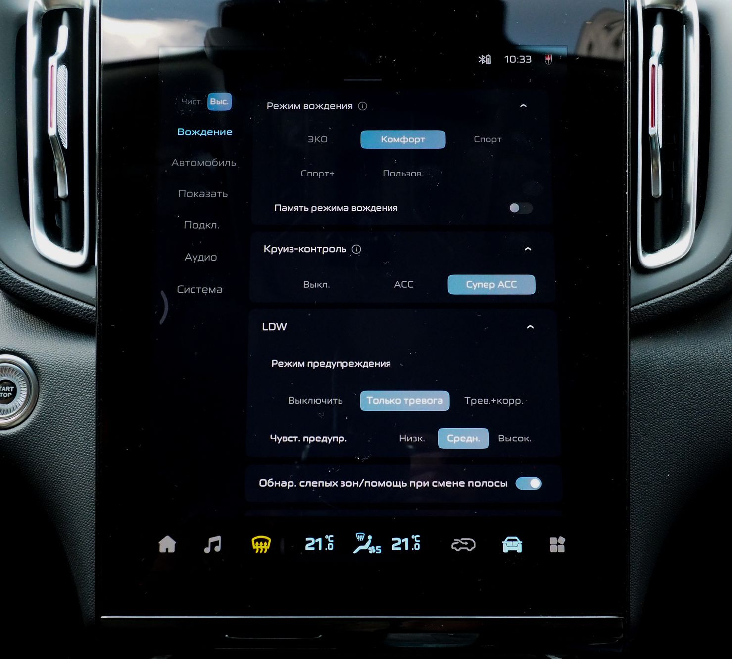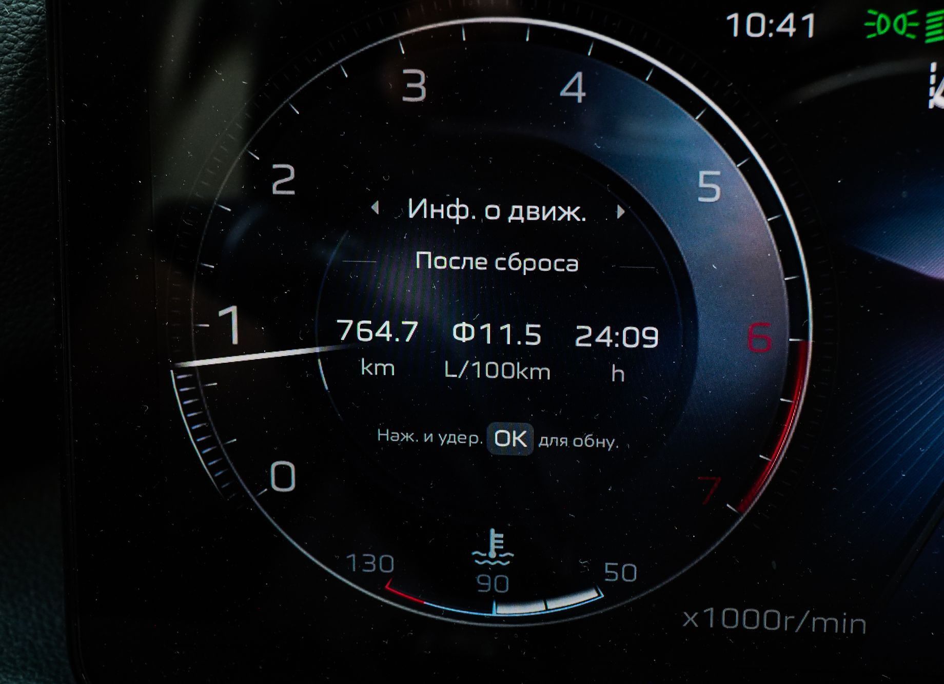Тем не менее ездить по городу в режиме «Эко» вполне нормально, но только в режиме «я у внучки дедушка». Опять же, только в этом режиме можно получить обещанный расход в 7,5 литров на сотню, да и то если никуда не спешить и ехать очень размеренно. Реально же при сколь-нибудь энергичной езде в городе с пробками получается расход порядка 11-11,5 л/100 км. Примерно так же ощущается и движение по скоростным трассам. На магистралях с двумя и более полосами в одном направлении можно преспокойно ехать в режиме «Эко» и экономить горючее, ну а в более сложных условиях, например, под дождем, можно выставить режим «Комфорт» (при этом автоматически включится и полный привод). Но если вам предстоят обгоны при наличии встречного транспорта – лучше сразу включить режим «Спорт». Почему не «Спорт+»? А в режиме «Спорт+» недоступен адаптивный круиз-контроль, который очень облегчает жизнь и гарантирует, что даже при наличии камер вы не получите «писем счастья» с фотографиями вашей машины. Адаптивный круиз действительно работает очень хорошо, не цепляется за автомобили в соседнем ряду, а к управлению им при помощи третьего подрулевого рычажка привыкаешь очень быстро. Единственный момент – увеличение заданной скорости происходит дискретно, через 5 км/ч, так что выставить, к примеру, 108 км/ч при движении по дороге с ограничением 90 у вас не получится. Точнее, так: для этого нужно вручную разогнать автомобиль ровно до этих самых 108 км/ч и в этот момент включить круиз-контроль. Впрочем, можно не заморачиваться: если спидометр показывает ровно 110, то GPS как раз и покажет реальную скорость 107-108 км/ч.