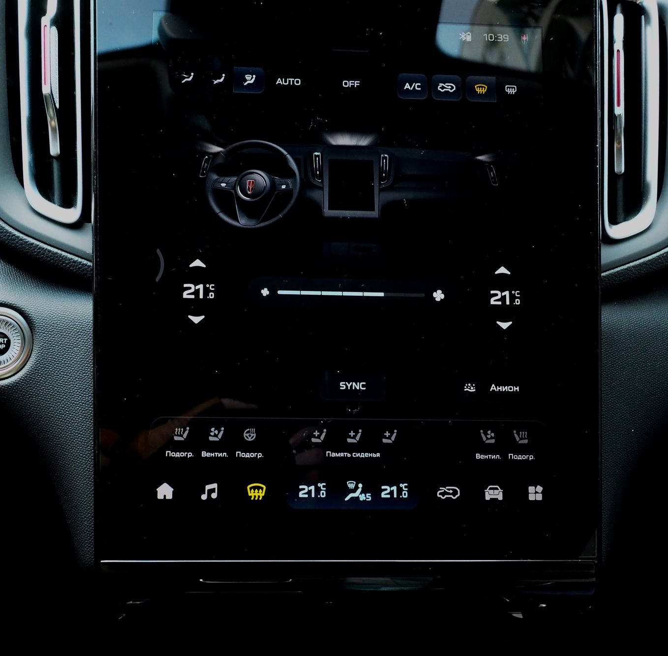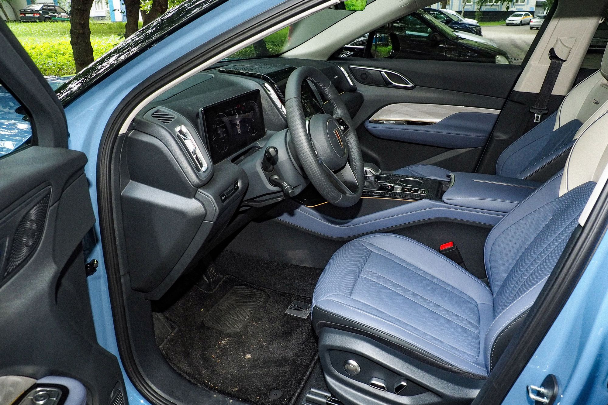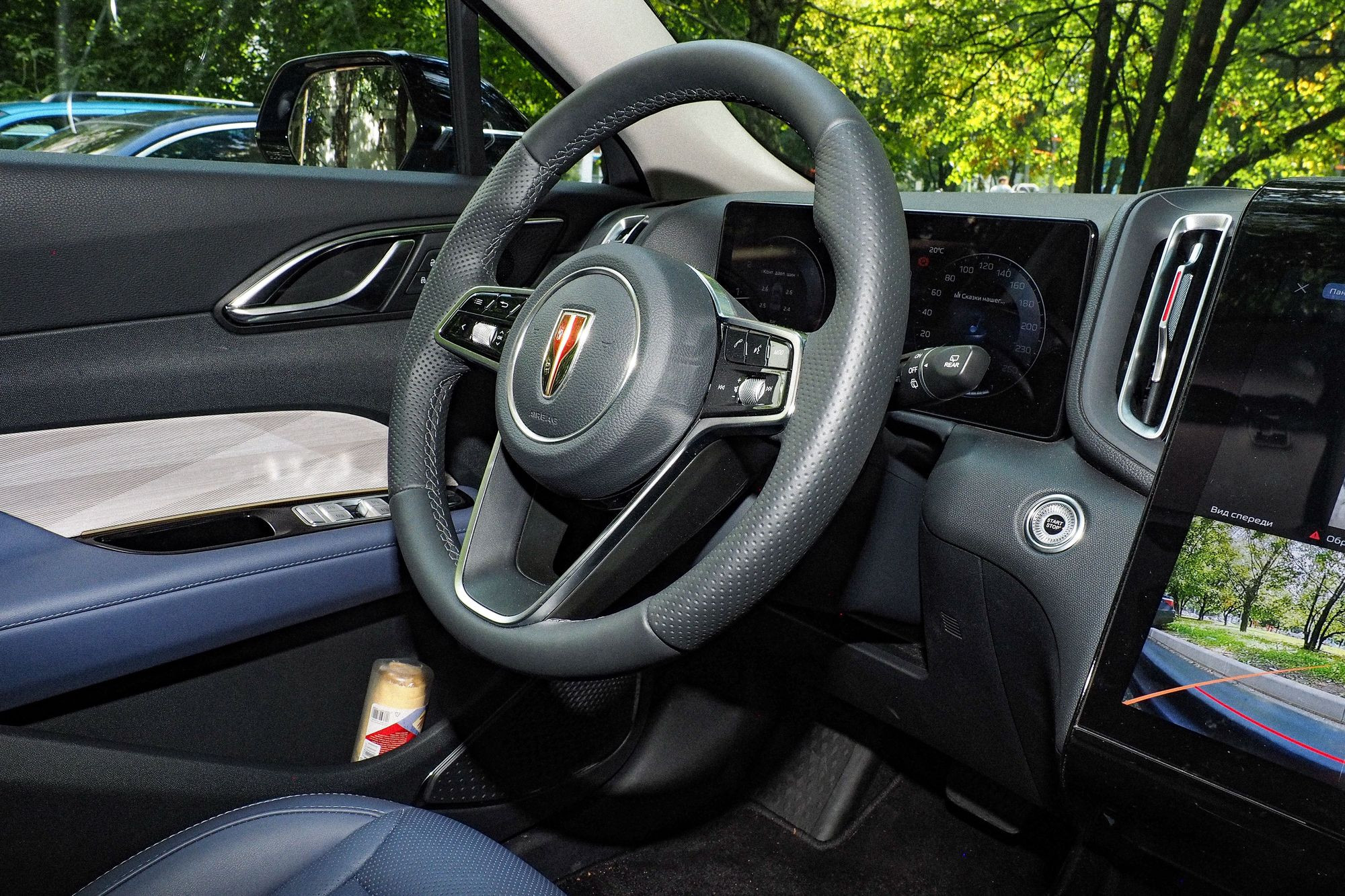 Если заглянуть на первый ряд сидений, то сразу чувствуешь некоторое сходство, хотя есть, конечно, и различия. В HS3 нет вставок ни под дерево (как в новом HS5), ни под «змеиную кожу»; вместо единого блока из двух дисплеев установлены два отдельных экрана, один – заменяющий комбинацию приборов и крупный 12,6-дюймовый сенсорный дисплей с вертикальной ориентацией. Сенсорные клавиши управления климатом переместились с отдельной панели в нижнюю часть рамки центрального тачскрина, а блоки клавиш на спицах руля получили несколько другую форму и напоминают теперь положенную на бок эмблему марки. По пространству, предоставленному водителю и переднему пассажиру, вообще нет никаких отличий – ведь по ширине кузова HS3 и HS5 различаются всего на 5 мм. Но стоит занять рабочее место водителя, как ты понимаешь, что различия все-таки есть.