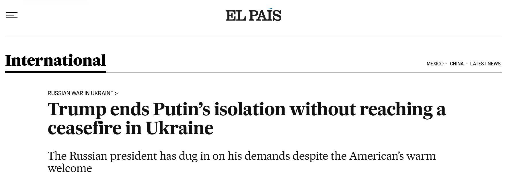 «Трамп положил конец изоляции Путина, не достигнув перемирия на Украине», — гласит заголовок испанской газеты.