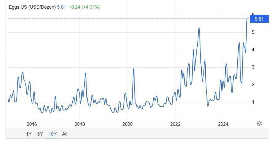 Цены на яйца в США выросли до рекордных $5,81 за десяток из-за птичьего гриппа.