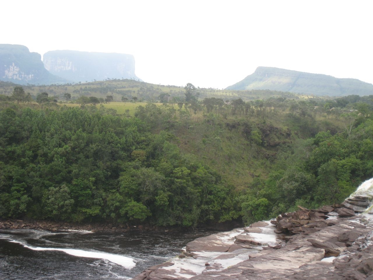 Сверху самого водопада не видно, зато прекрасные виды на сьерру и знаменитый Ауян-тепуй, над которым замечаем радугу.