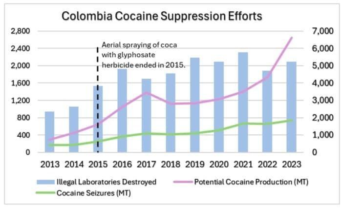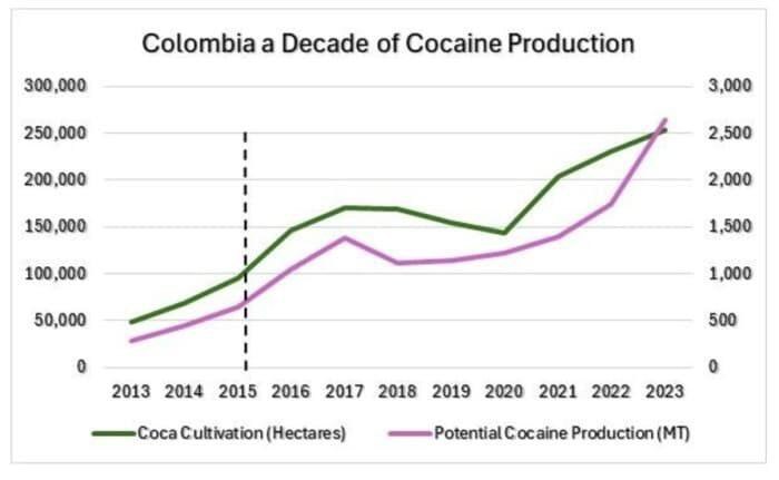 Кокаин опередил нефть и занял первое место в экспорте Колумбии. В 2023 году страна произвела 2664 тонны белого порошка, что на 52% больше, чем годом ранее.