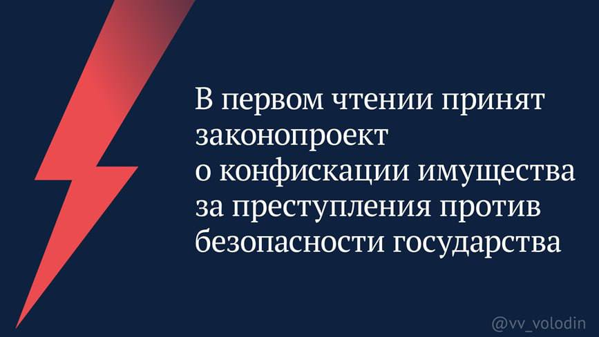 Законопроект о конфискации имущества, а также о лишении почётных званий за преступления против безопасности Российской Федерации принят в первом чтении.
