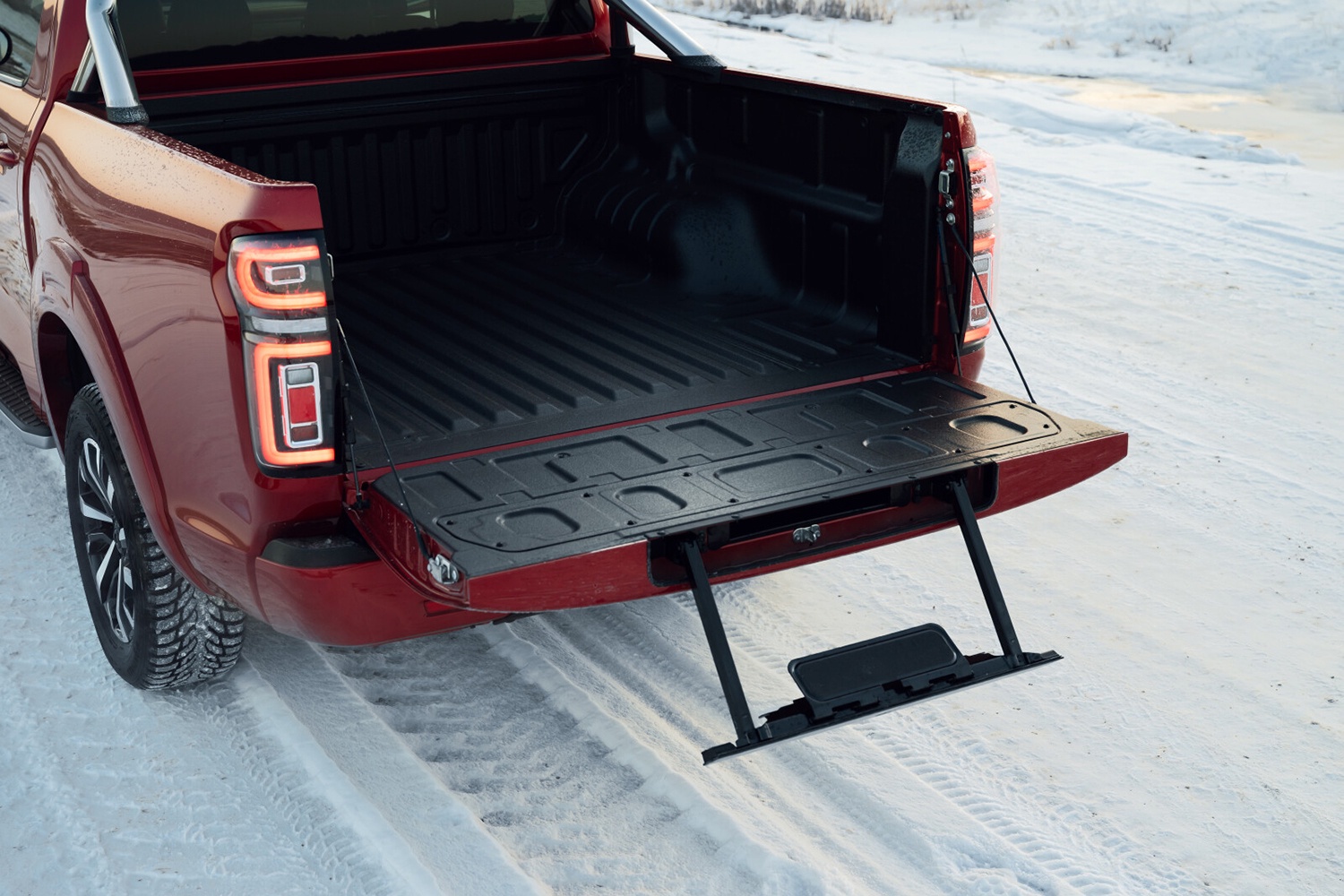 Попадание в салон автомобиля облегчено наличием массивной боковой подножки и присутствием удобных ручек на водительской и пассажирских стойках. Кроме того, в грузовом отсеке установлены ступеньки, помогающие без хлопот достать все необходимое из кузова пикапа.