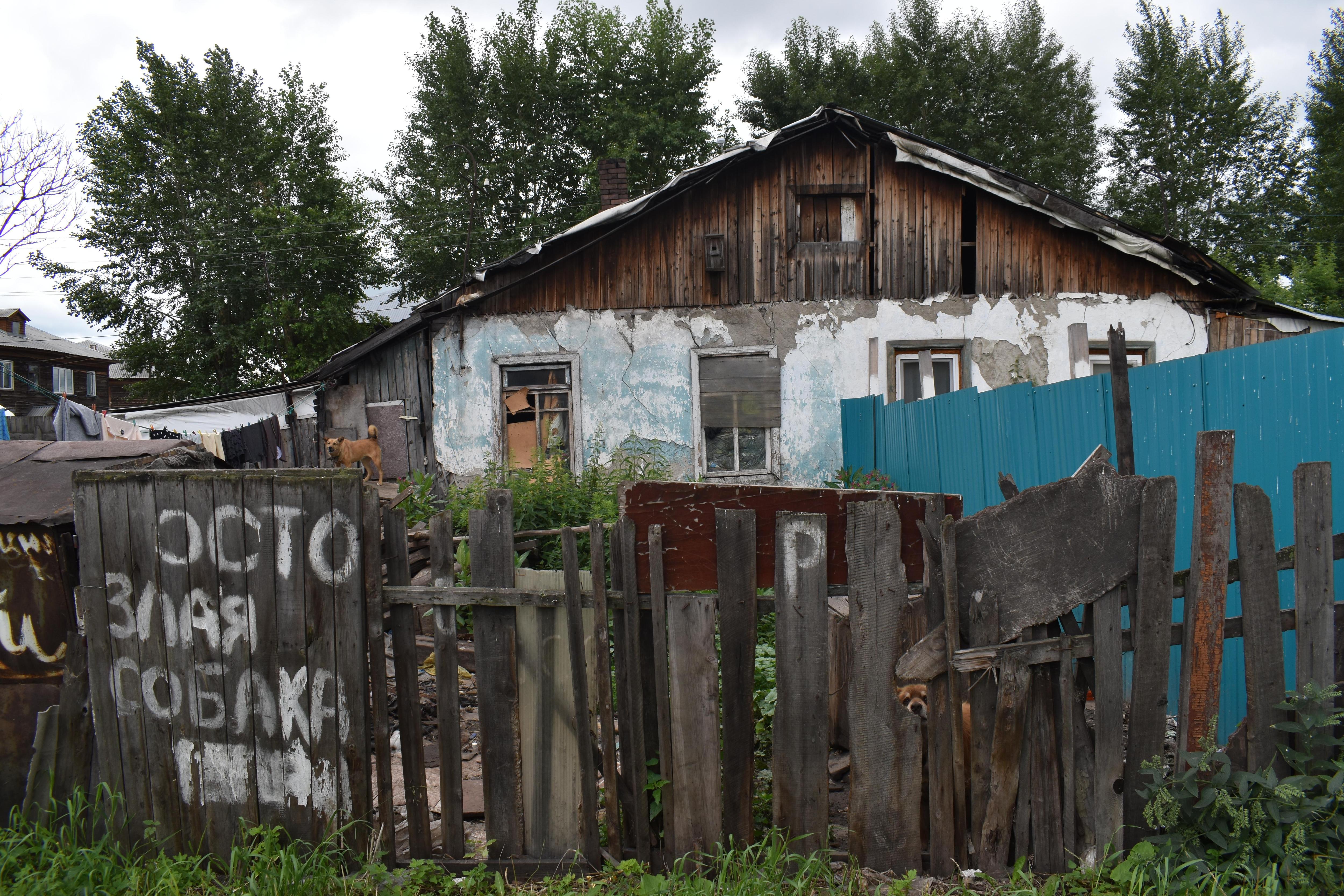 Неблагополучный двор и дом на четырех хозяев на улице Шевченко в Оби производят гнетущее впечатление. На кривом, всем в заплатках, заборе несколько раз продублирована надпись «Осторожно, злая собака». Сами собаки при приближении посторонних поднимают шум, но стоит немного отойти — замолкают. Мимо шныряют тощие кошки с плохой шерстью. За забором отчетливо просматриваются горы всевозможного хлама. Запах вокруг дома — соответствующий.