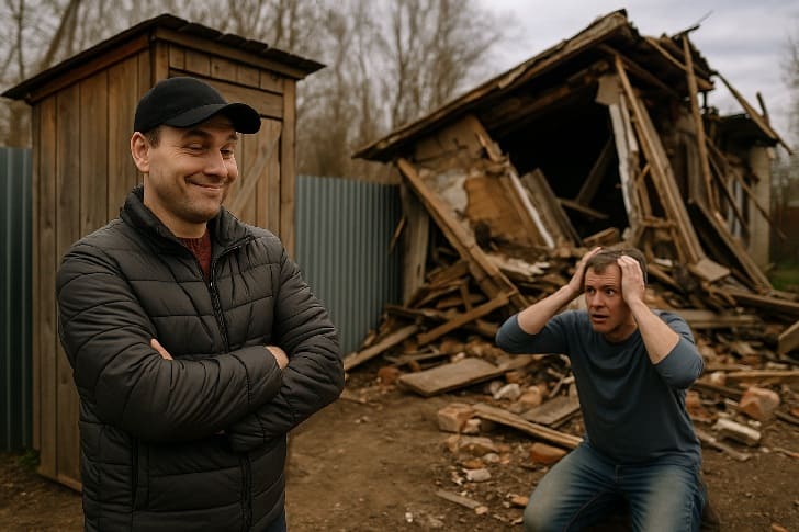 Думали, что построить туалет — дело простое? В одной деревне всё вышло куда масштабнее: конфликт с уличным сортиром закончился сносом дома, проверками и внезапным перевоспитанием нового соседа.