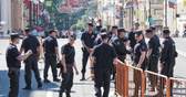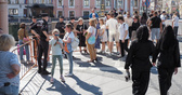 Главную магистраль города отдали пешеходом в день праздника «Алые паруса». Выпускники в нарядах выходят на проезжую часть, чтобы сделать фото. За происходящим внимательно наблюдают сотрудники полиции.