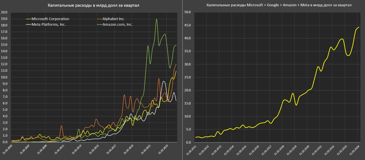 В структуре капитальных расходов на Amazon приходится 14.9 млрд за 1кв24 (53.4 млрд за год), на Microsoft – 11 млрд и 39.5 млрд за год, на Google – 12 млрд и 38 млрд за 12 месяцев, а Meta – 6.4 млрд и 26.8 млрд соответственно.