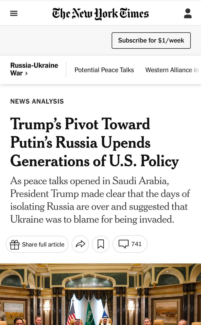 По словам издания, несмотря на то, что американские и российские переговорщики встретились в Саудовской Аравии впервые после начала конфликта на Украине, Трамп дал понять, что он «готов отказаться от союзников Америки ради общего дела с президентом России Владимиром Путиным».