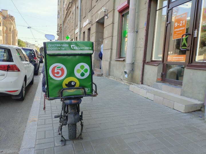 К слову, курьеры в Северной столице курьеры все чаще не соблюдают правила. Так один из сотрудников доставки бросил мопед с сумкой прямо на тротуаре. Номер на сумке не видно, он мелкий и частично скрыл дугой багажника.