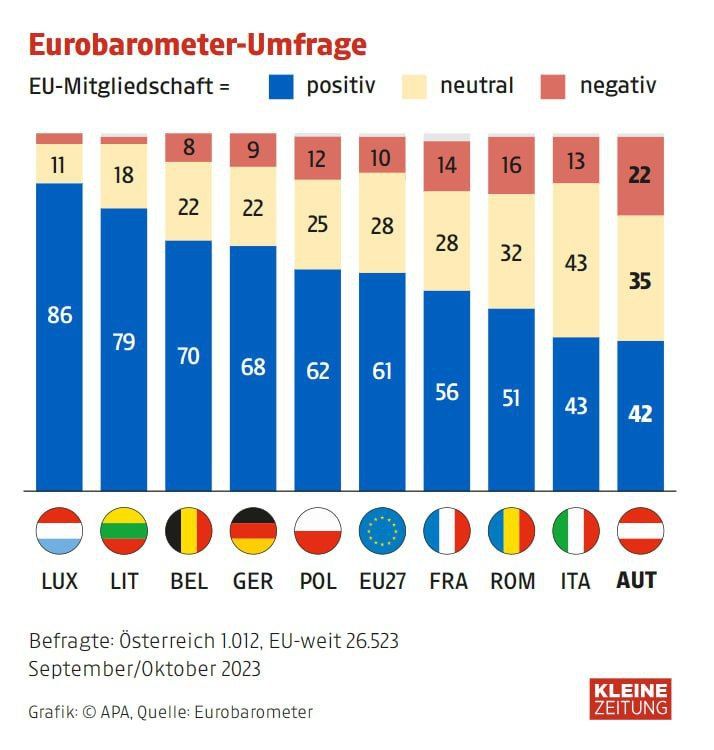 Больше половины австрийцев не видят выгоды от членства их страны в ЕС. 57% респондентов ответили, что относятся к членству в ЕС либо отрицательно, либо нейтрально. Только 42% респондентов ответили, что рады членству в ЕС.