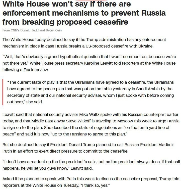 Представитель Белого дома Кэролайн Ливитт не ответила на вопрос о том, имеет ли администрация Трампа какой-либо механизм принуждения на случай, если Россия нарушит предложенное США «прекращение огня».
