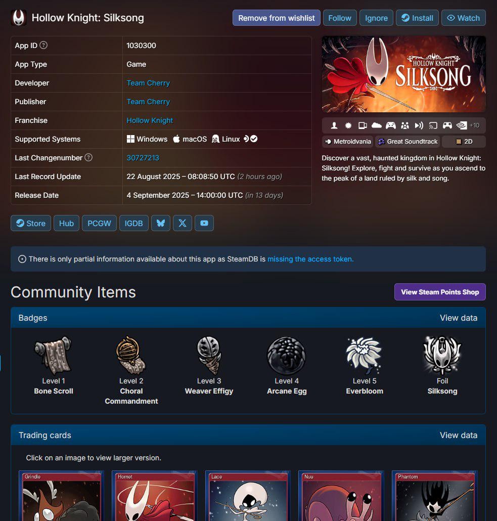 Как заметили внимательные пользователи, страница Silksong теперь демонстрирует набор торговых карточек и предметов сообщества, которые можно получить через игровой процесс. Хотя наличие таких материалов стандартно для релизов в Steam, их появление служит еще одним подтверждением того, что игра действительно готова к выходу.