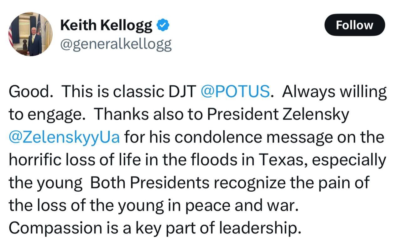 Он отметил, что Трамп «всегда готов к общению». Также он поблагодарил Зеленского за его соболезнования по поводу гибели людей в результате наводнения в Техасе, особенно среди молодежи.