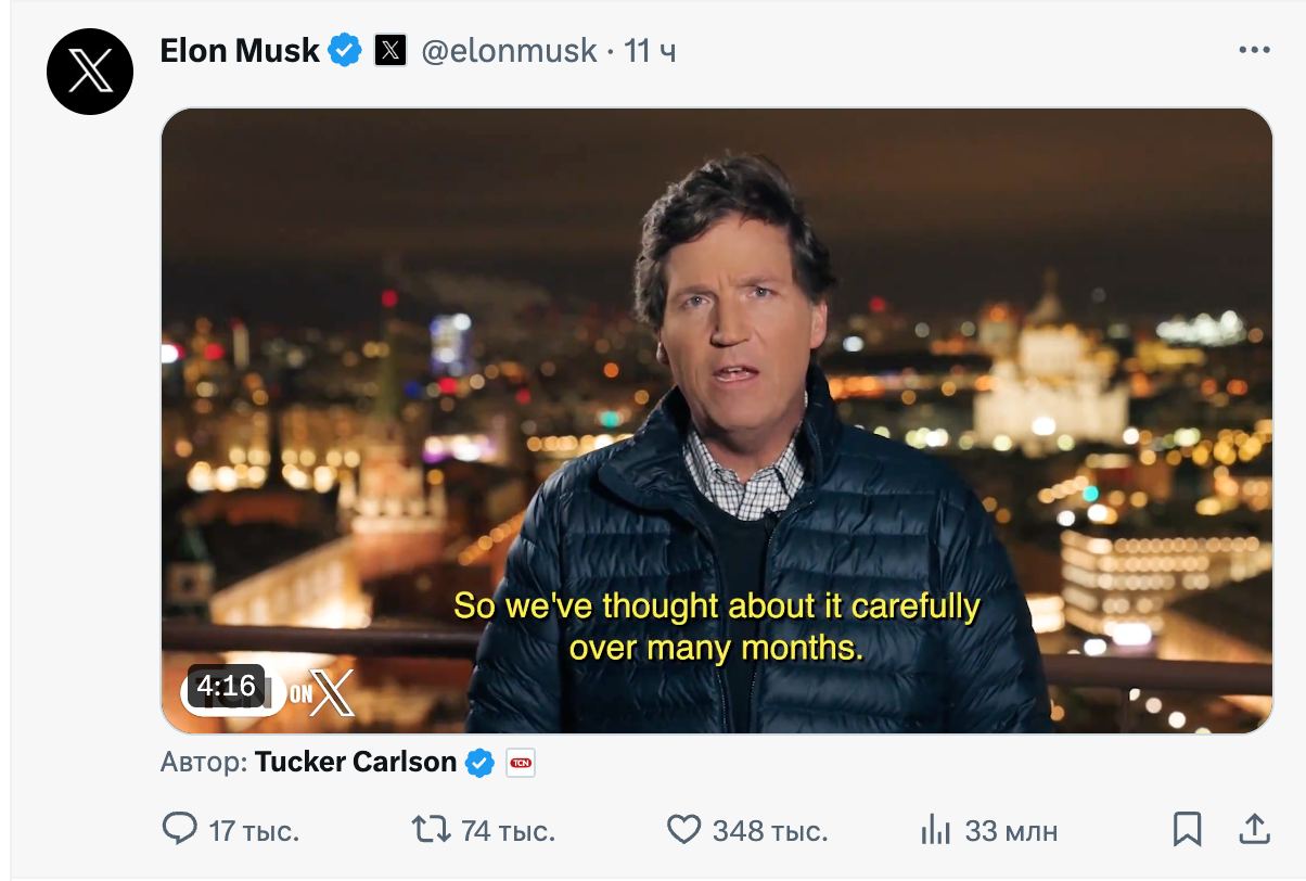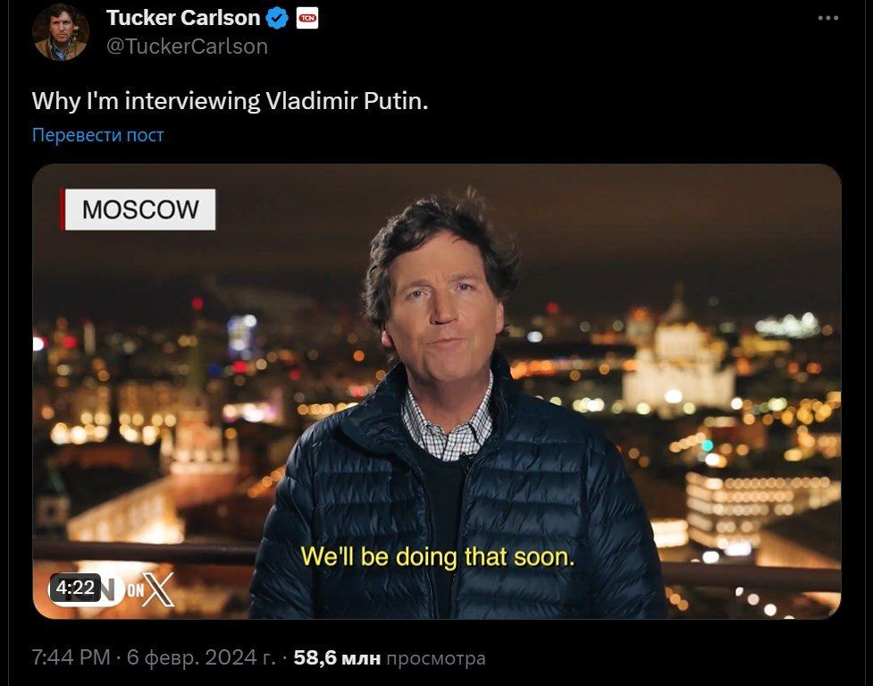 Анонс интервью с Путиным набрал у Такера Карлсона уже больше 50 миллионов просмотров в Х.
