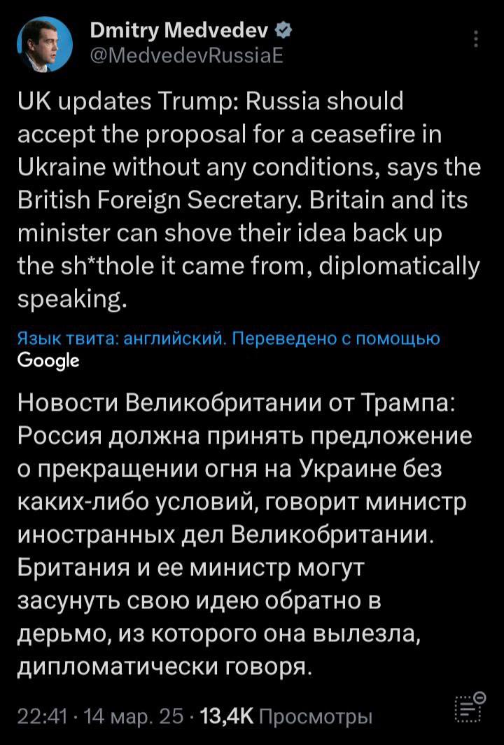 πΈ ΠΠ°ΠΌΠΏΡΠ΅Π΄ Π‘ΠΎΠ²Π±Π΅Π·Π° Π ΠΎΡΡΠΈΠΈ ΠΠΌΠΈΡΡΠΈΠΉ ΠΠ΅Π΄Π²Π΅Π΄Π΅Π², Π΄ΠΈΠΏΠ»ΠΎΠΌΠ°ΡΠΈΡΠ΅ΡΠΊΠΈ Π³ΠΎΠ²ΠΎΡΡ, ΠΎΡΠ²Π΅ΡΠ³ ΡΠ»ΡΠΈΠΌΠ°ΡΡΠΌ Π³Π»Π°Π²Ρ ΠΠΠ ΠΡΠΈΡΠ°Π½ΠΈΠΈ ΠΊ Π ΠΎΡΡΠΈΠΈ.