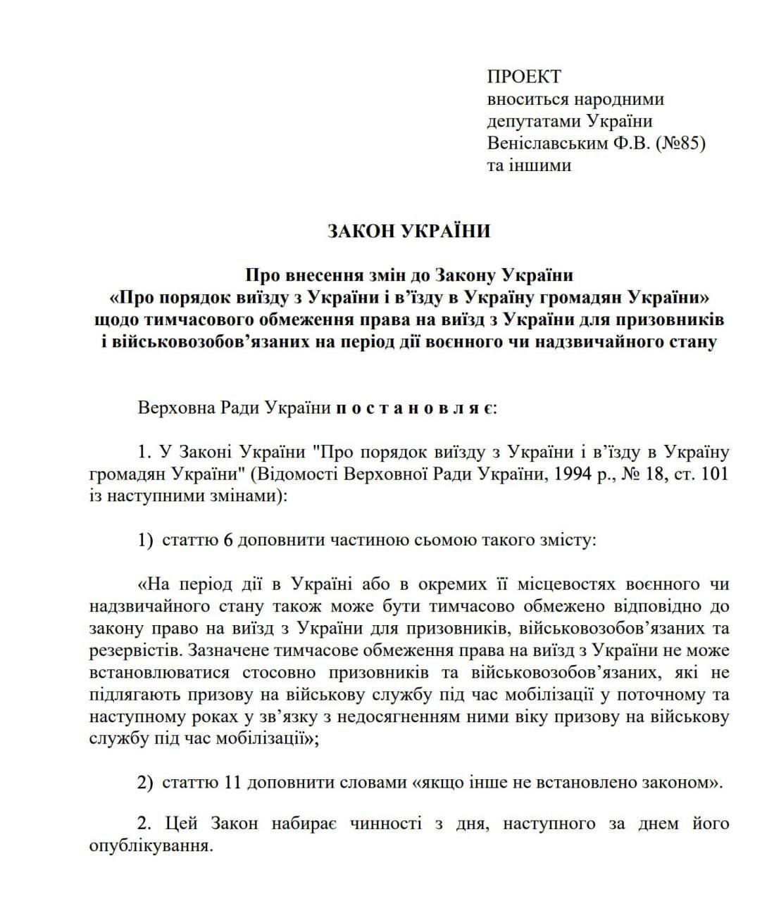 В Раду внесли законопроект 13685 о разрешении выезда за границу украиинским мужчинам младше 24 лет. Среди авторов — глава правоохранительного комитета Завитневич и многие другие «Слуги народа». Платформа X (ru)|Платформa Х (eng)|BlueSky|WhatsApp