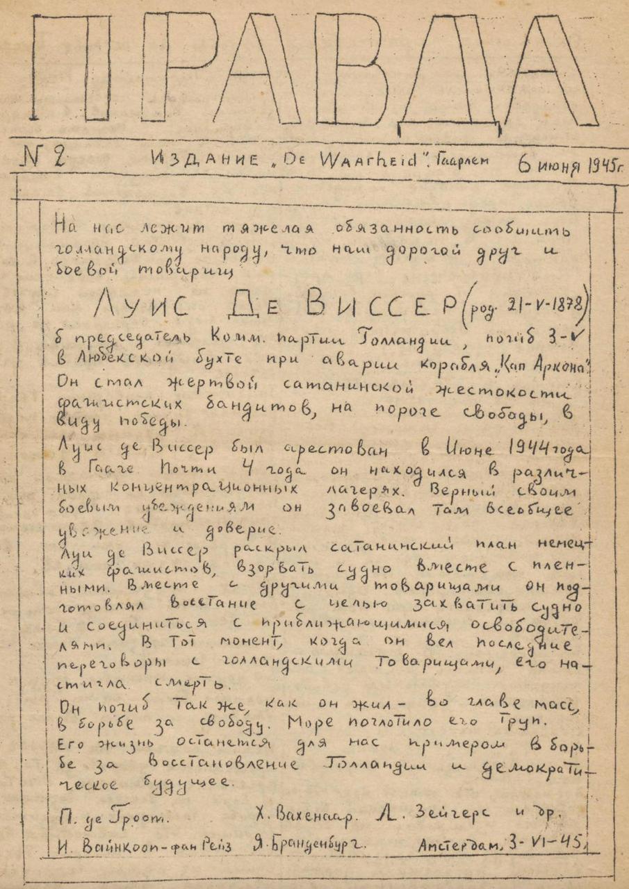 В «газете» описывается гибель бывшего лидера голландской Компартии Луиса де Виссера, который погиб 3 мая 1945 г. на корабле «Кап Аркона». Но авторы «Правды» явно лукавят, когда пишут об «аварии» и «жертве сатанинской жестокости фашистских бандитов». Потому что плавучую тюрьму «Кап Аркона» разбомбила британская авиация, а тех узников, которые пытались добраться до берега, расстреливали английские же самолёты.