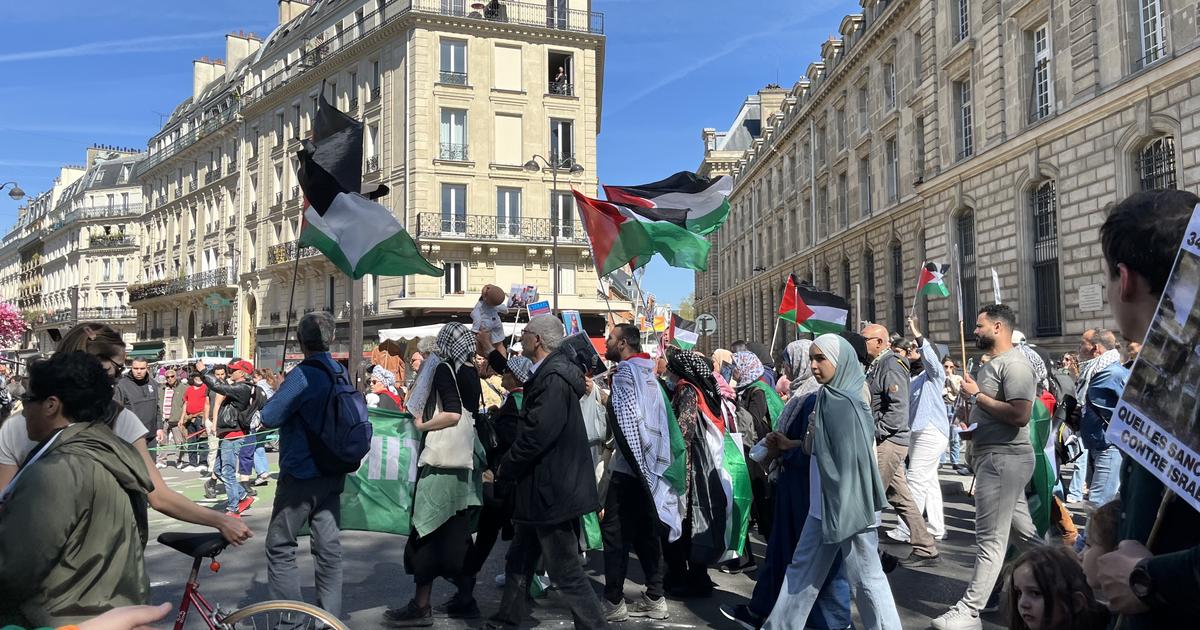 La place de la République ce dimanche est noire de monde. Ou plutôt, de toutes les couleurs selon les drapeaux brandis, verts pour les Jeunes écologistes, bleu et violet pour les Insoumis, bleu pour le syndicat étudiant Unef. Il est 15h et les discours successifs à la tribune viennent de prendre fin, quand d’un coup, un changement s’opère. Les pancartes contre Marine Le Pen et condamnant le RN s’abaissent, remplacés par une multitude de drapeaux palestiniens. Une partie des manifestants s’éparpille, l’autre se voit greffée de plusieurs centaines de militants pro-palestiniens revêtus de keffieh qui s’élancent boulevard de Magenta, en direction de Stalingrad, dans le nord de Paris.