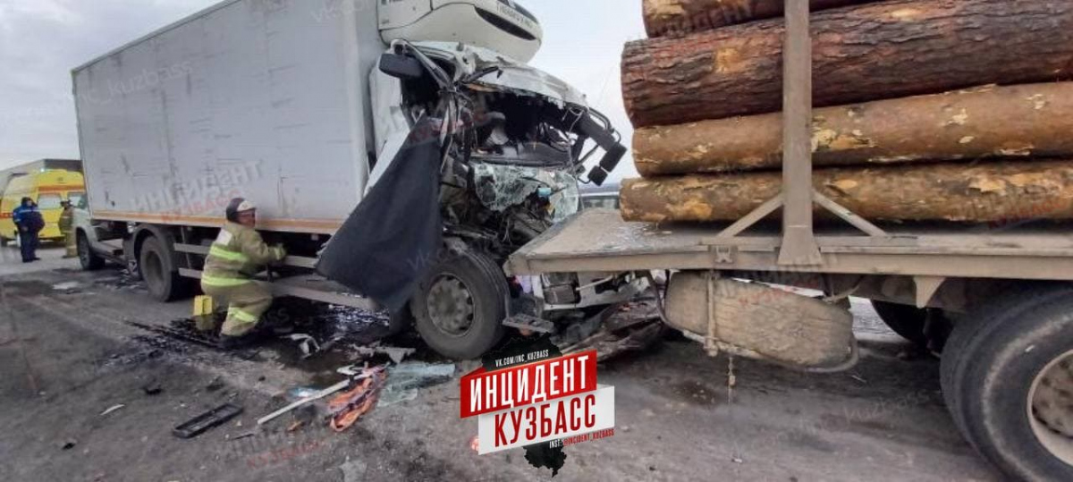 На кадрах видно, что грузовик "догнал" лесовоз, а сзади в него въехал кроссовер.